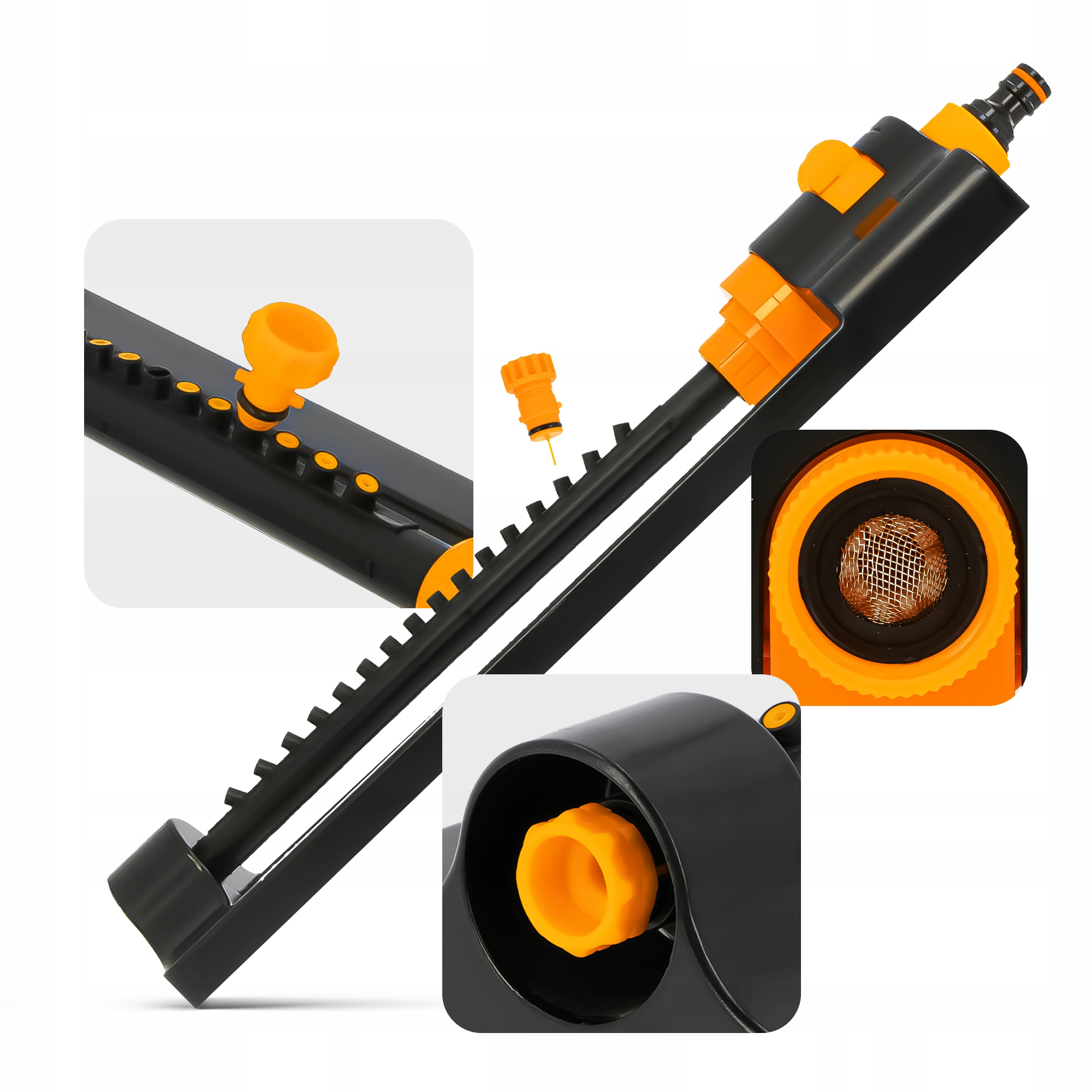 Разбрызгиватель также оснащен быстроразъемным разъемом, позволяющим быстро и без проблем подсоединить садовый шланг и подключиться к оросительной системе.