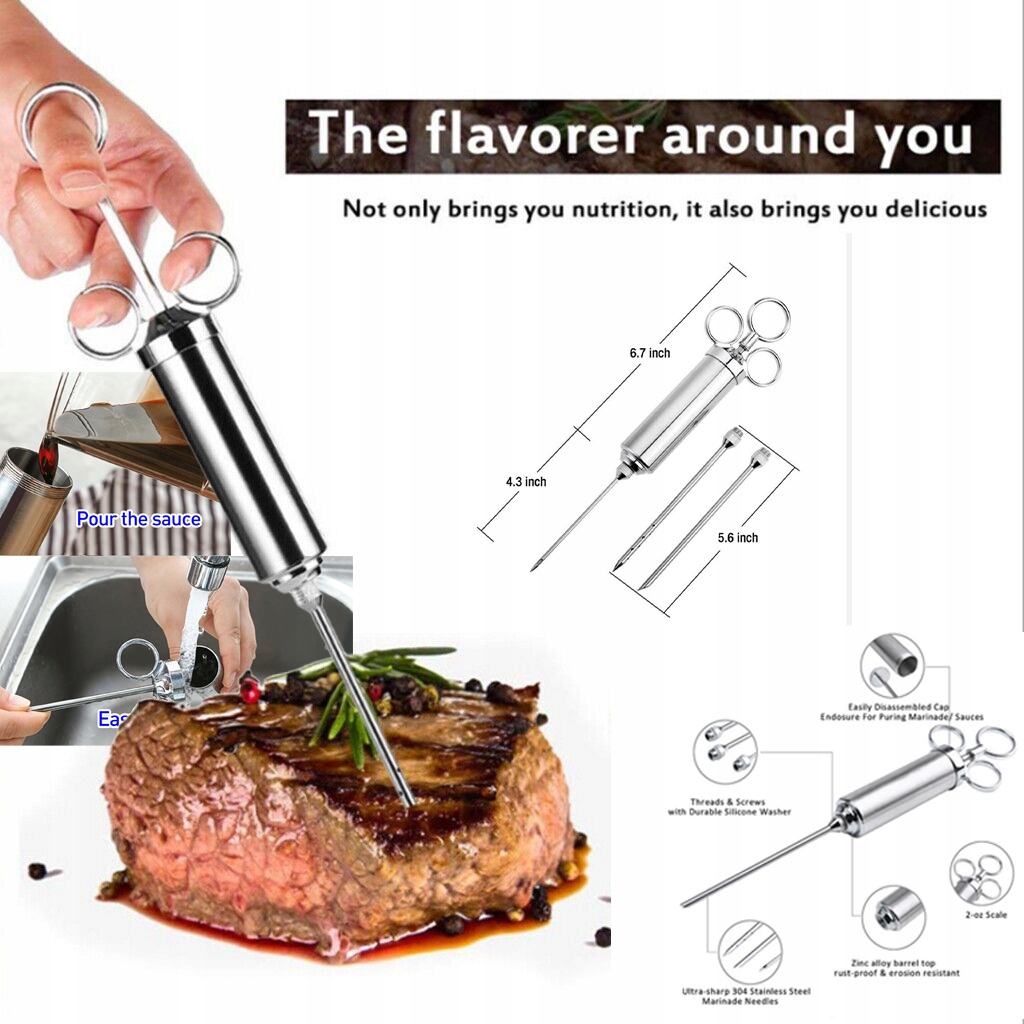 Наш инвентарь оснащен тремя иглами разных размеров, которые позволяют применять маринады в соответствии с вашими потребностями. Игла с широкой розеткой она идеально подходит для нанесения маринадов с большими кусочками специй