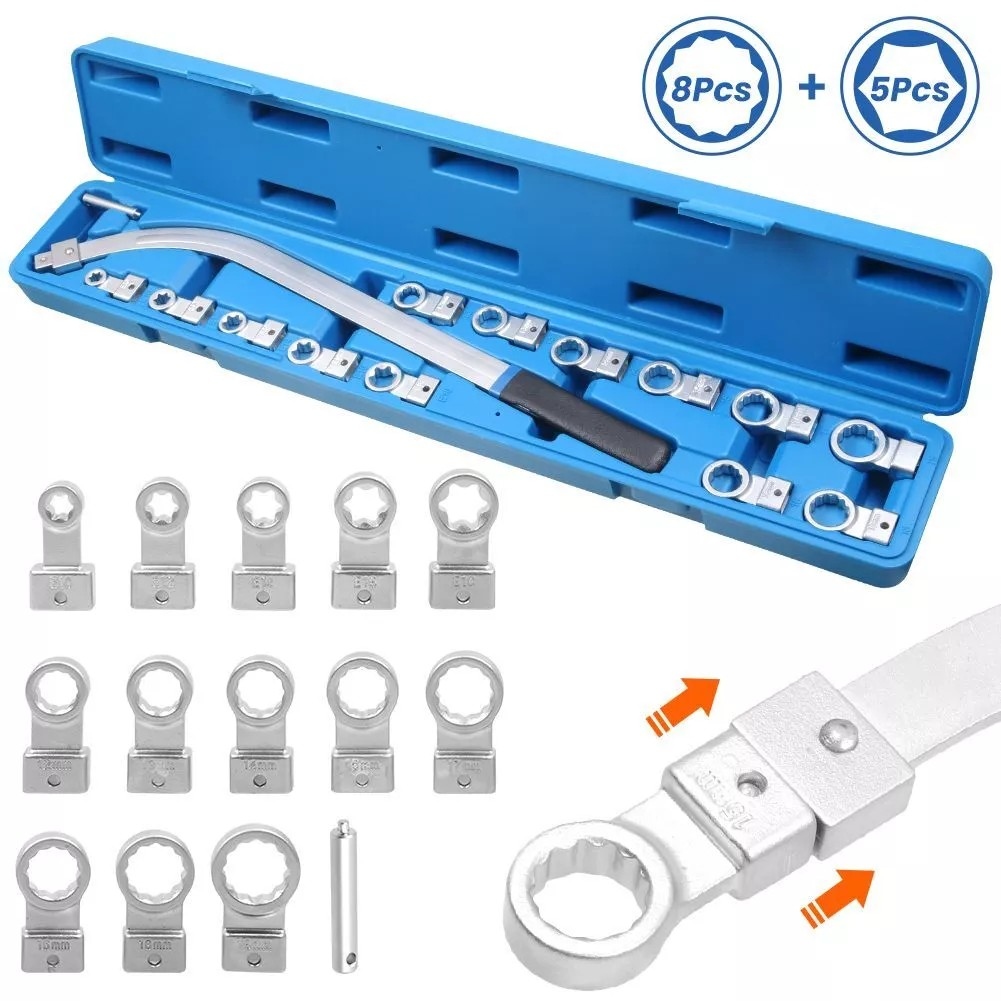 - Гаечный ключ для демонтажа натяжителей со сменными наконечниками и погнутой ручкой. В комплект входят 13 насадок TORX и насадки с проушинами популярных размеров.