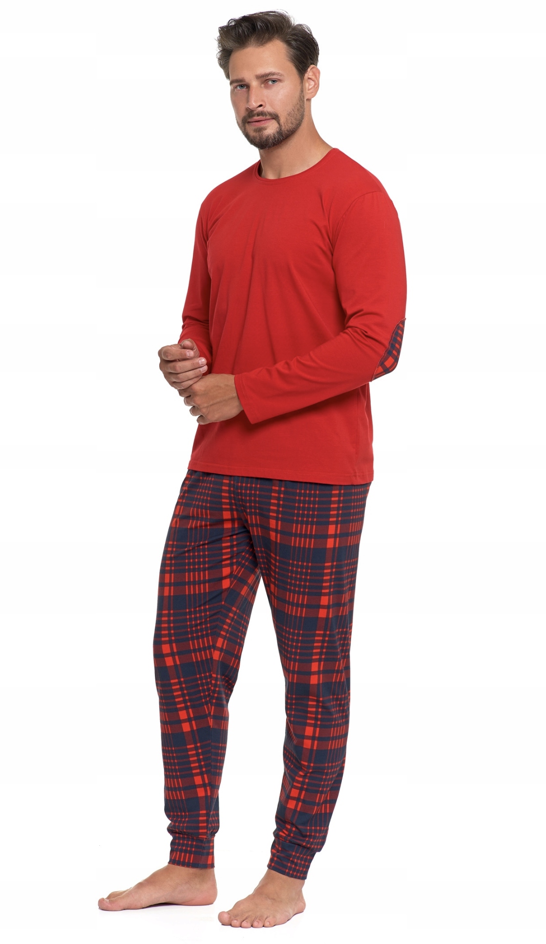 Стильная мужская пижама, состоящая из двух частей: гладкая красная малага с длинными рукавами и контрастное пластырь в клетчатых локти и брюках в классическом рисунке плед. Это добавляет сплоченность и элегантность к набору. Брюки имеют гибкую талию, обеспечивая комфорт ношения.