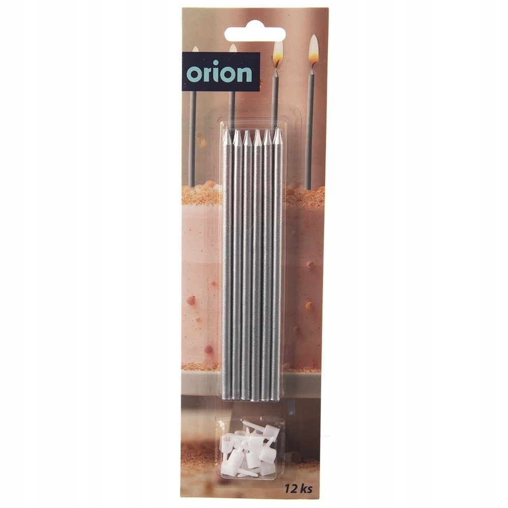 Набор из 12 длинных свечей для торта. Серебряные свечи универсальны, подходят к любому торту. Оснащены подставками для удобного размещения и практичны в использовании. Свечи являются неотъемлемой частью каждого дня рождения. Оригинальный продукт чешского бренда Orion. Произведен в соответствии с европейскими стандартами.