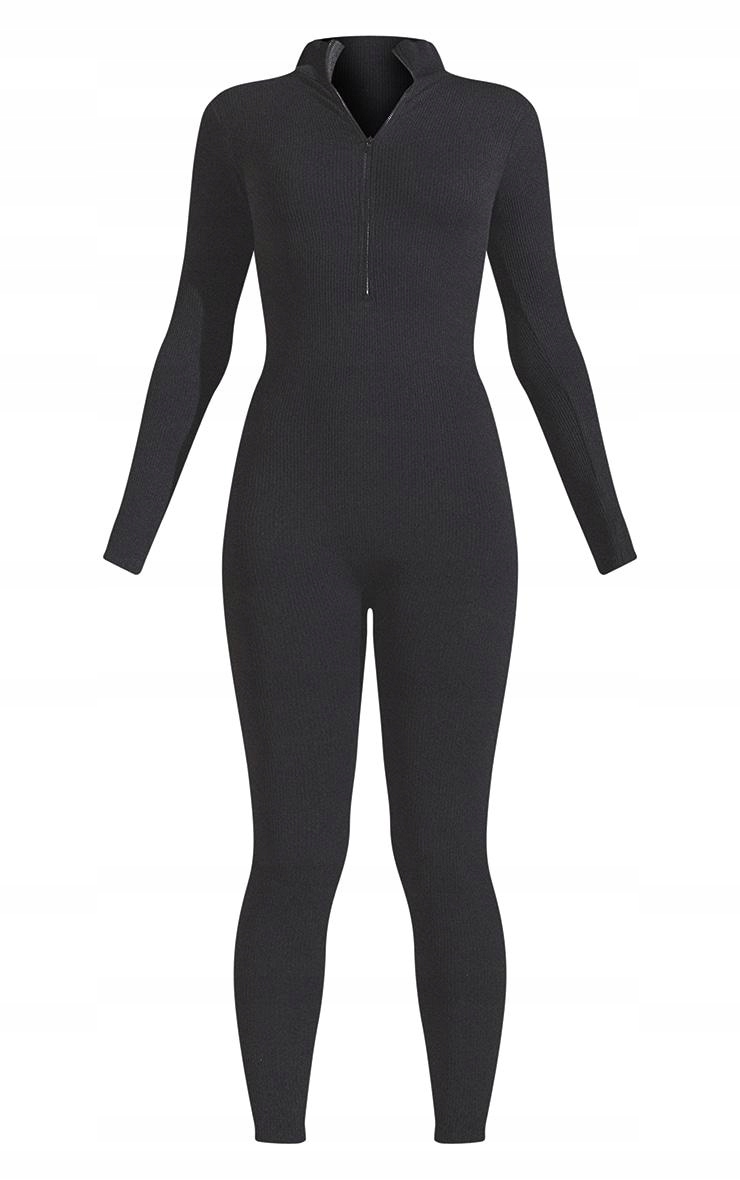 ДЛИННЫЙ ЧЕРНЫЙ КОМБИНЕЗОН В РЕБРУСКУ, ОДИНАКОВЫЙ, НА МОЛНИИ PRETTYLITTLETHING S