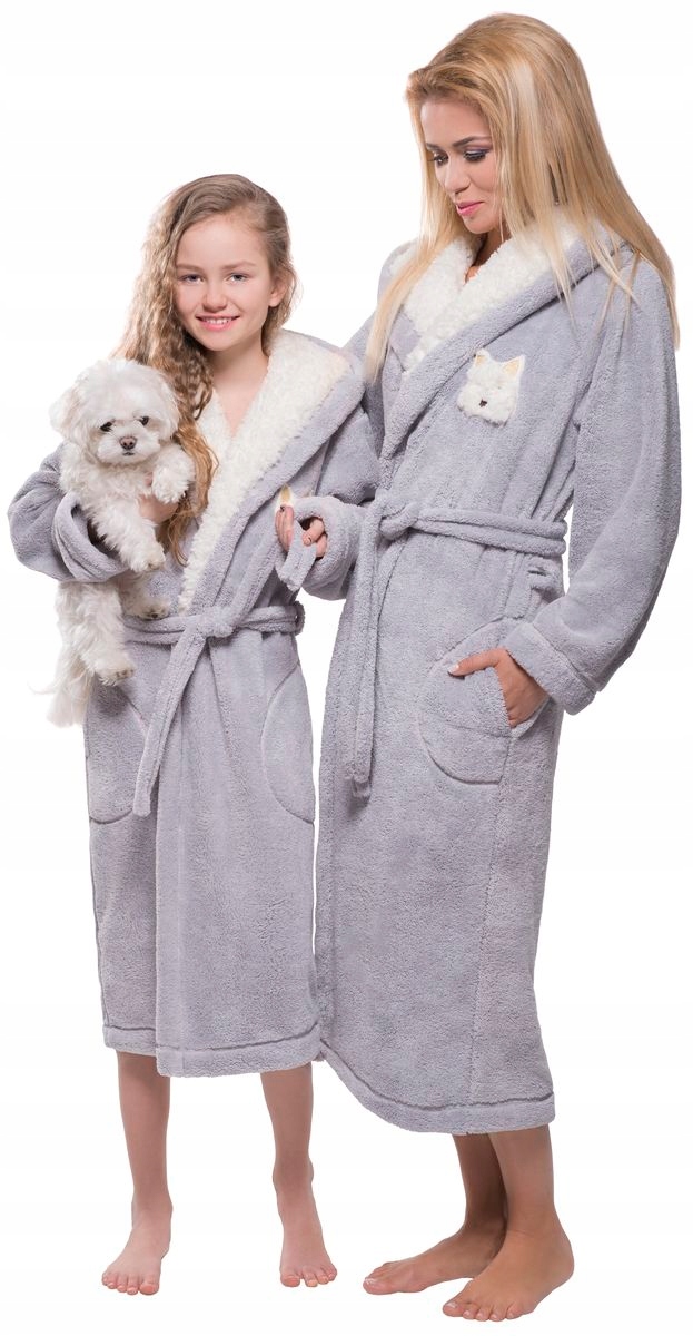 Длинный халат приглушенных тонов с капюшоном, отделанным красивым ворсистым материалом. На груди милая аппликация с собачкой.