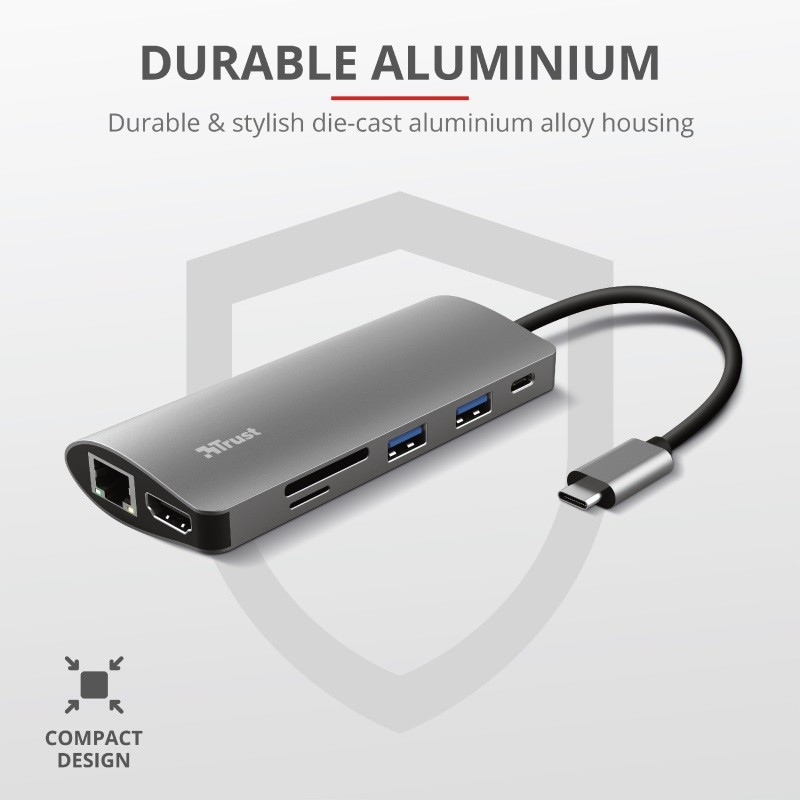 - Тонкие ноутбуки великолепны, но их отсутствие портов соединения может быть проблемой. Ну, нет больше. С помощью Trust Dalyx 7-W-1 ваша производительность увеличится семь раз благодаря прикрепленному HDMI, Ethernet, картам памяти, USB и USB-C. ГБ / с через USB. Или используйте порт Ethernet для подключения вашего ноутбука к домашней или офисной сети, чтобы получить быстрый доступ в Интернет. И благодаря подключению HDMI 1.4 вы даже можете подключить монитор 4K с HDR, чтобы ваши фотографии выглядели более красочными, чем когда -либо. Один из семи портов-это разъем USB-C, который поддерживает энергопотребление до 5 a/100 Вт, благодаря которому он идеально подходит для передачи электроэнергии из источника питания. Небольшой размер в сочетании с твердым алюминиевым корпусом означает, что вы возьмете его везде. Это не требует дополнительного источника питания, и когда вы находитесь на фотосессии или даже в отпуске, прикрепленный считывание карт обеспечит легко создавать резервные копии фотографий