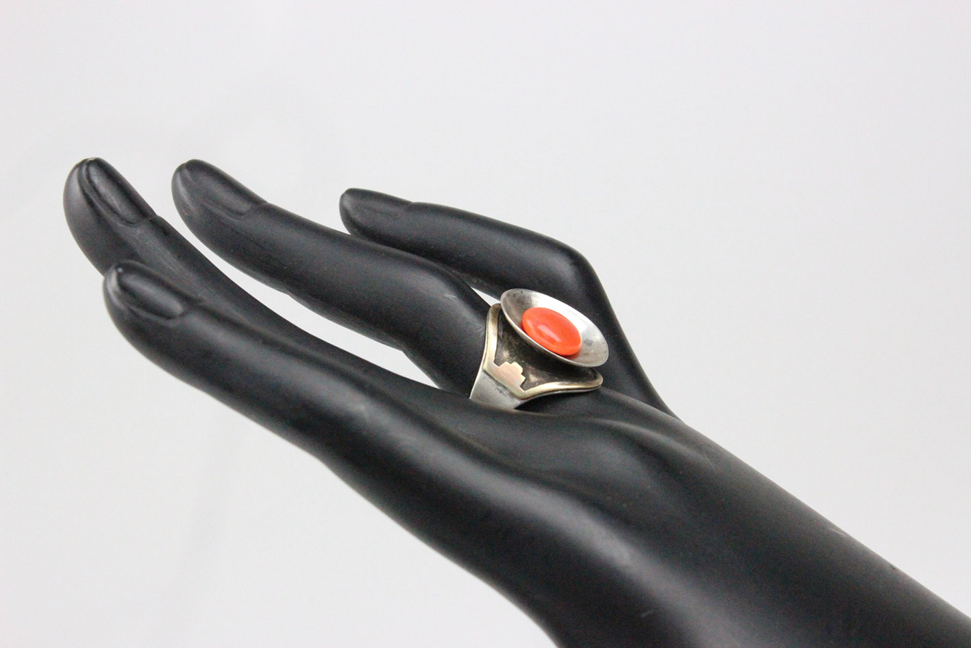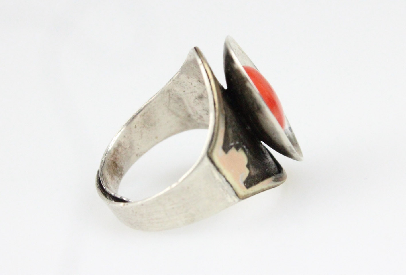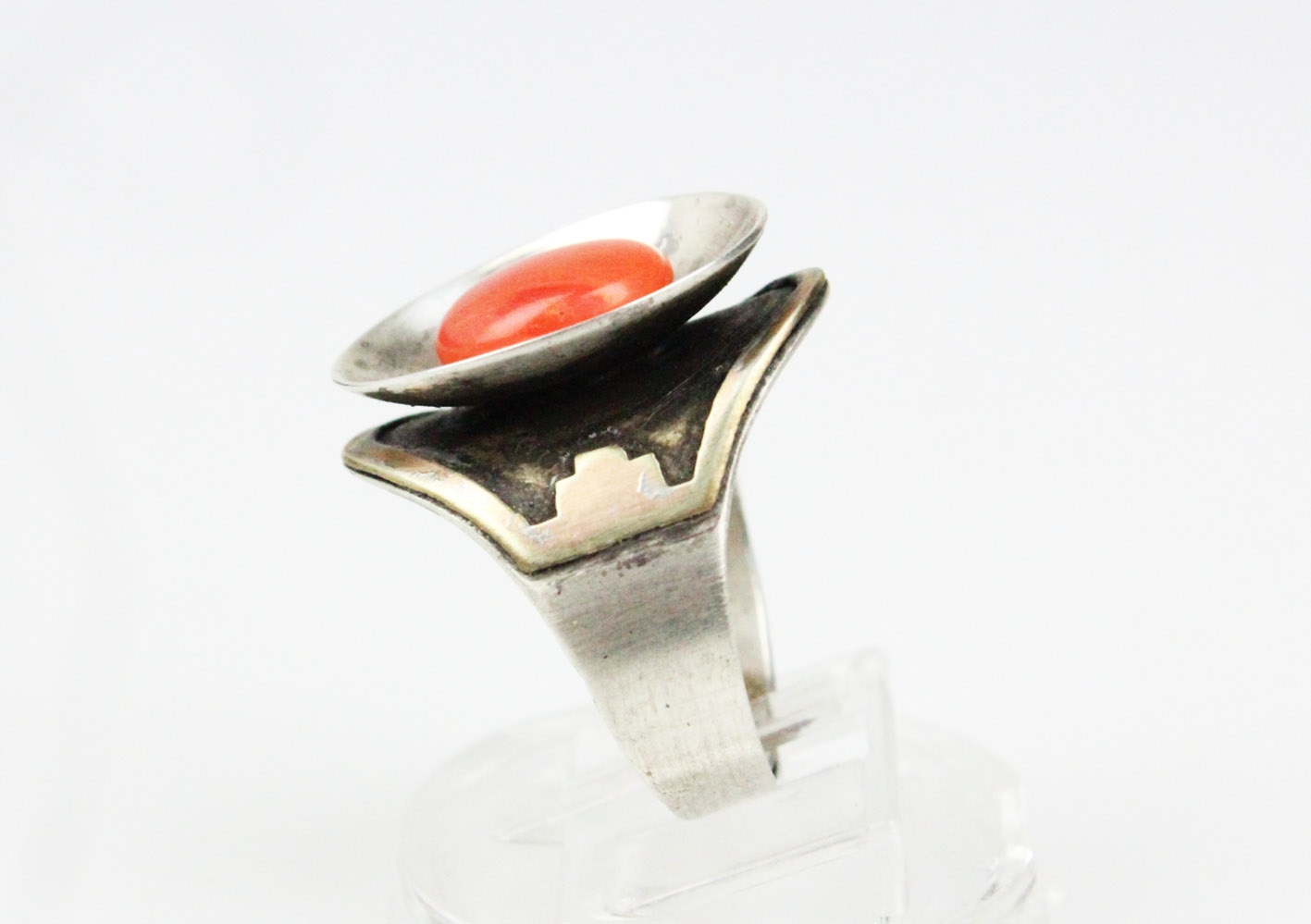Впечатляющее кольцо 1930-х годов. Обручальное кольцо открытого типа, расширяющееся вверх, с открытой головкой пластины, украшенной драгоценным кораллом. Кольцо из серебра 835 пробы с позолоченными элементами. Очень хорошее состояние. Размеры: