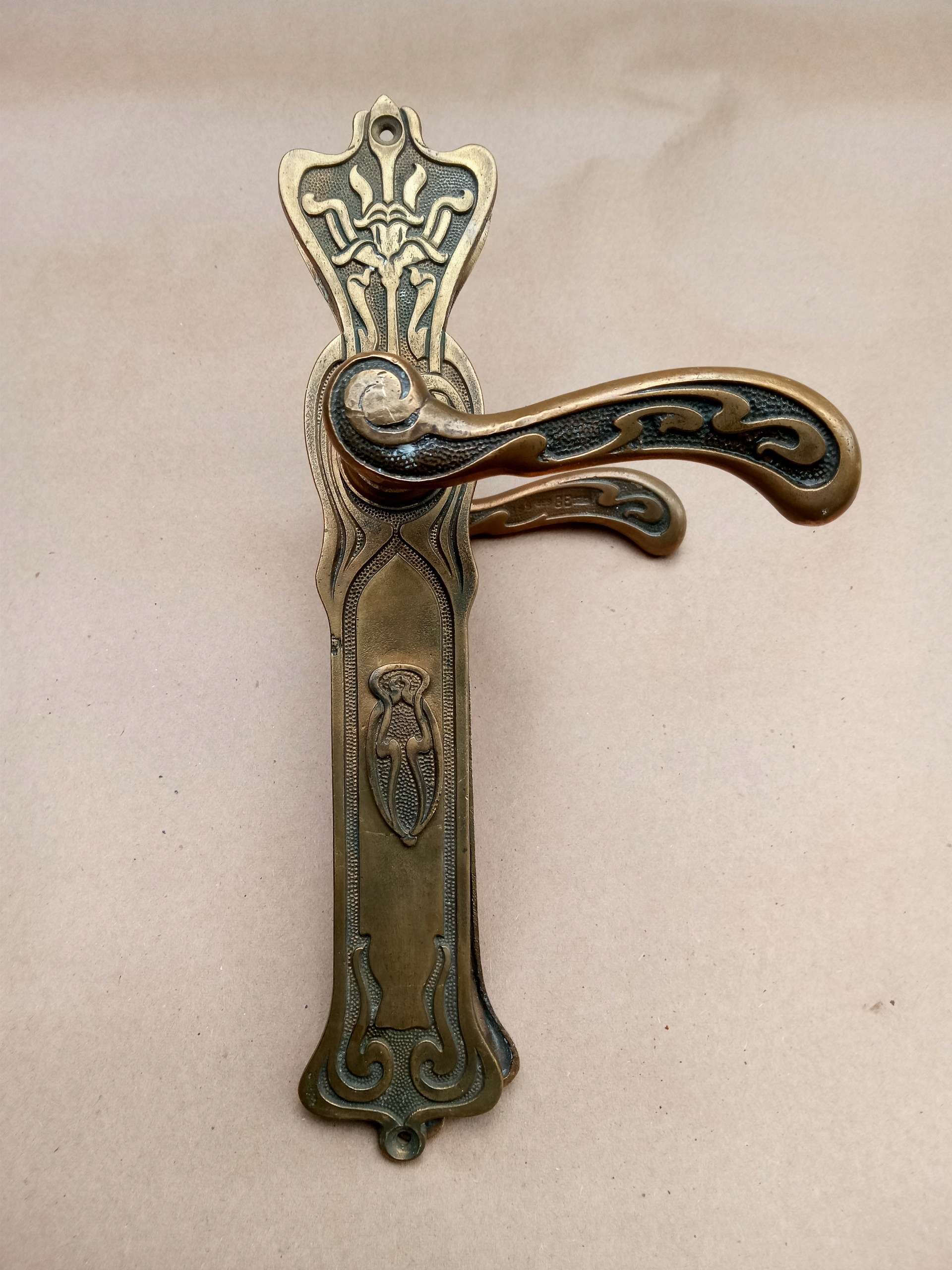 бронза или латунь, оригинальные дверные ручки в стиле модерн с накладками, высота накладок ок. 27 см, ширина тарелок ок. 5,7 см, дверные ручки и накладки составляют один оригинальный комплект, подписан каталожными номерами, в одной накладке увеличено отверстие для ключа вниз, оттенок может незначительно отличаться от реального, год производства ок. 1900