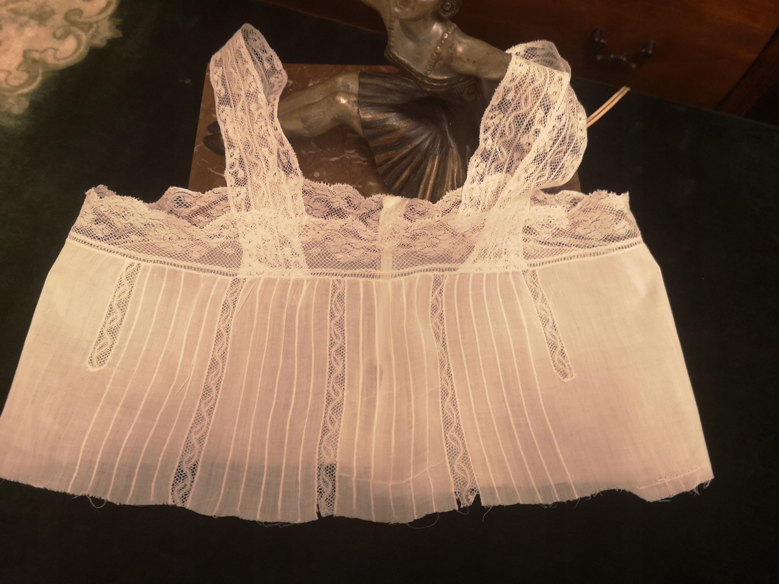 Верхняя часть подъюбника белого цвета с красивыми тюлевыми шнурками, вероятно, начала 19 века. 20 век. Ткань обновилась, по-прежнему выглядит прочной и находится в хорошем состоянии. Размеры: окружность 74 см, высота центральной части 18 см. Приглашаю вас принять участие в торгах и на других моих аукционах.