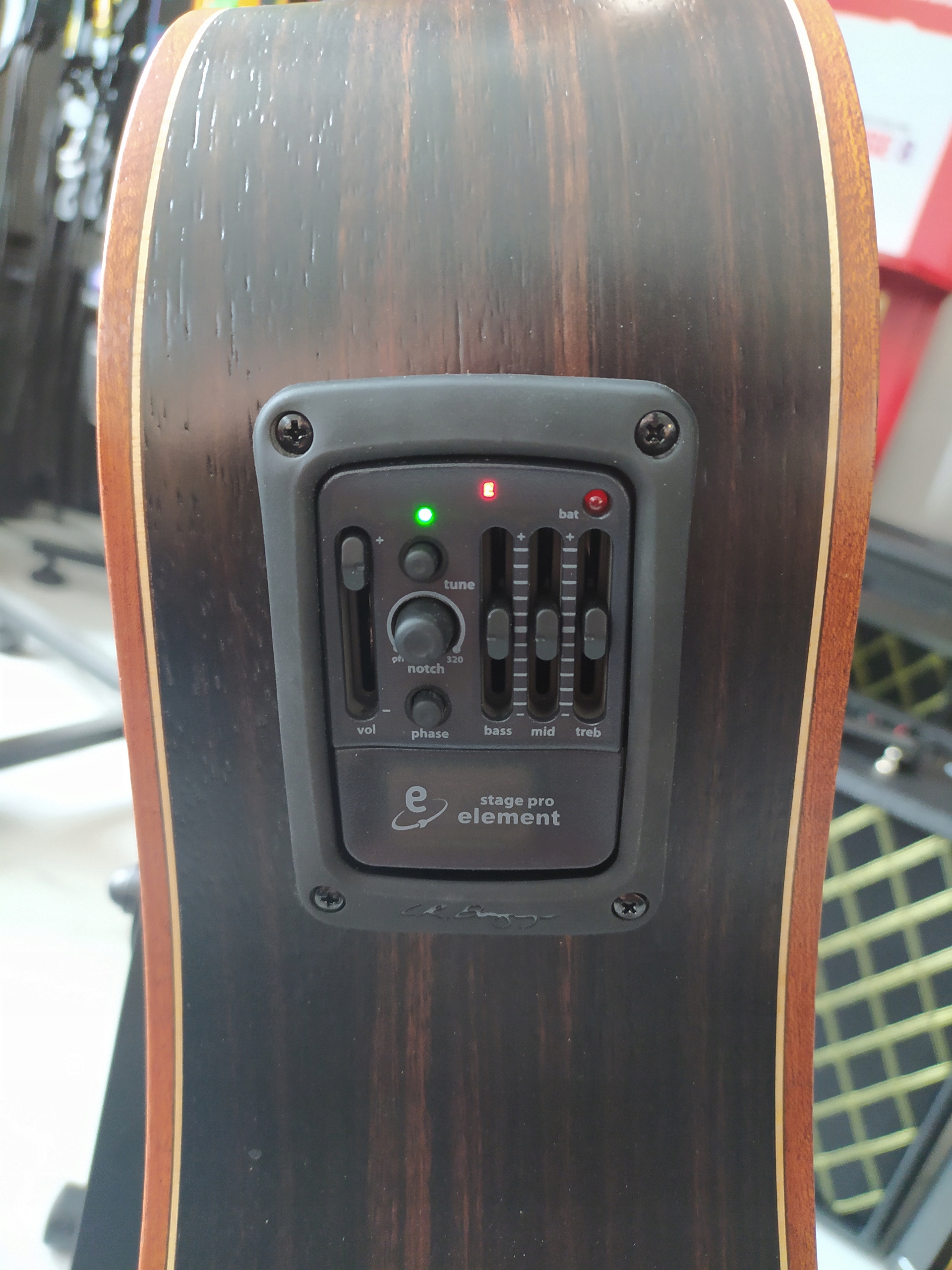 lr Baggs Stage Pro Element - одна из самых интересных гитарных звуковых систем, основанной на предыстории высочайшего качества и пьезоэлектрической насадки. То, что отличает spe от пьезо -преобразователей других компаний, определяется исходным запатентованным элементом пикапа. Казалось бы, обычный пикап, но он отличается от всех остальных тем, что он активен по всей своей длине - то есть для выбора звука - это часть, расположенная под основанием, которая собирает вибрации непосредственно из -под струн, но также и часть, установленная внутри гитарной коробки между мостом и предусилителем. Это действие является своего рода подражанием микрофона, который успокаивает звук датчика. Встроенный предварительный усилитель Stage Pro -это устройство, работающее в классе A, которое является большим преимуществом которого является низкий уровень шума, получая чрезвычайно теплый, приятный звук. Предспространственный элемент stadePro имеет трехэквалификационный эквалайзер высокого, среднего и низкого тона, фильтр Notch в технологии Garrett Null, переключатель обращения фазы, хроматический тюнер, индикатор заряда батареи и быстрый доступ к его замене.