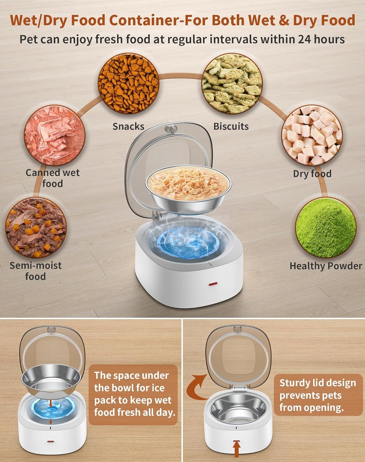 - Двойное обслуживание поддерживает свежие продукты - для влажных продуктов наш автоматический кормушку доставлен с 3 мешками льда, которые поддерживают мокрые свежие и полезные продукты в течение дня. Перед использованием пакета льда заморозьте в течение 4-8 часов. Для сухой пищи наш запатентованный ротор в съемном дне контейнера и закрыта сверху, крышка предотвращает получение домашних животных в кормление, чтобы получить дополнительную пищу. Сумка для сушки и уплотнительный ремешок поддерживают свежесть и хрустящую пищу.