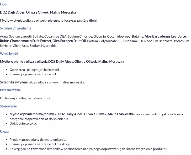 Просматривая «Доза ежедневно алоэ, оливковое масло, малина Морошка, жидкое мыло, 400 мл», вы можете быть уверены, что данный товар из каталога «Эмульсии и мыло» будет доставлен из Польши и проверен на целостность. В цене товара, указанной на сайте, учтена доставка из Польши. Внимание!!! Товары для Евросоюза, согласно законодательству стран Евросоюза, могут отличаться упаковкой или наполнением.