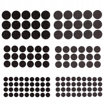 Набор черных самоклеящихся липучек трех размеров позволяет многократно соединять и разделять элементы.