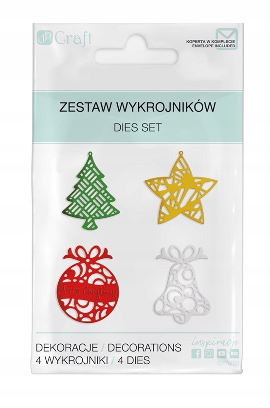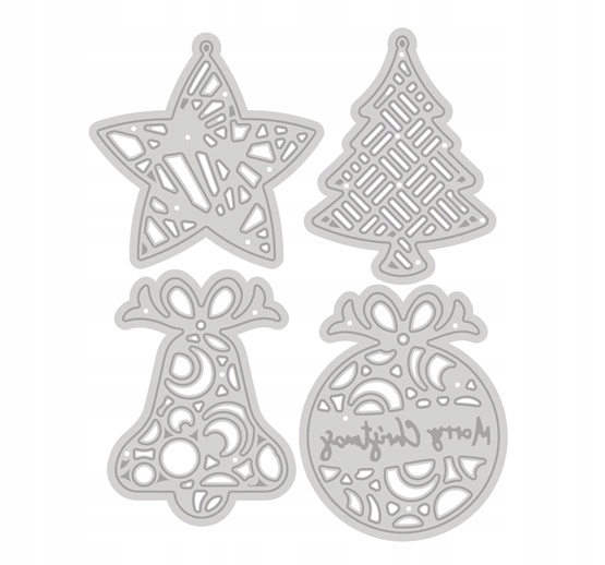 Набор штампов с открытыми рождественскими украшениями. На съемочной площадке вы найдете рождественскую елку, звезду, безделушку и колокол с отверстиями, которые можно повесить.