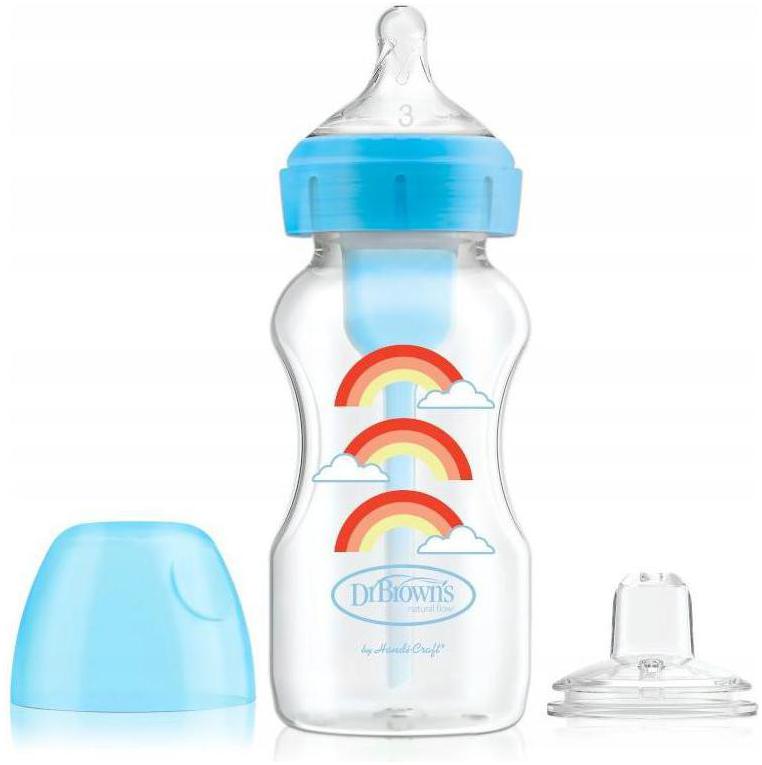 Бутылочка Dr Brown's Options+ с широким горлышком емкостью 1 мл. Объем 270 мл доступен в различных узорах и цветах. Набор предназначен для детей старше 6 месяцев. Можно мыть в посудомоечной машине на верхней полке и стерилизовать.