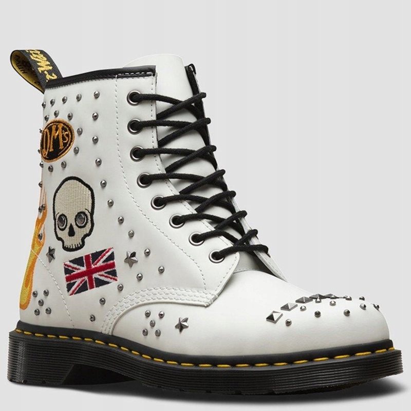1460 - первая легендарная модель Martens, символ которой происходит от даты введения его для продажи (0 1 .0 4 . 19 60 Год). Изготовлен из гладкой натуральной кожи в белом. Верхний украшен деталями, относящимися к классической рок-и ролле 50-х годов, такими как пирамиды и шпильки в форме звезд и вышитые пятна. Подошва сшита на верхнюю часть обуви с помощью знаменитой желтой нити (технология Goodyear Welted). В подошве, так называемая подушка безопасности. 100% Rockabilly
