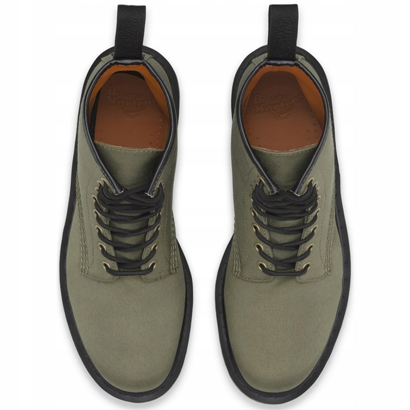 Оригинальные ботинки из коллекции обуви Dr. Док Мартенс. Шнуровка с восемью отверстиями. Изготовлен из плотного холста зеленого цвета (хаки) с пропиткой, с внутренней стороны подкладка из натуральной кожи оранжевого цвета. Подошва пришита к верху обуви знаменитой черной нитью (технология Goodyear Welted). Подошва имеет так называемую характеристику обуви Dr. Martens. воздушная подушка. АВИАТОР (ЦВЕТА НА ОСНОВЕ КУРТОК АМЕРИКАНСКИХ ПИЛОТОВ)