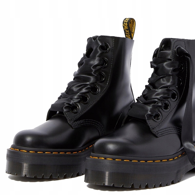 Оригинальные ботинки из коллекции обуви Dr. Док Мартенс. Строка #QUAD. Зашнуровано шестью большими декоративными люверсами. Изготовлен из гладкой натуральной кожи черного цвета. Вощеные шнурки (шнурки из атласной ленты в комплекте). Характерная подошва, пришитая к верху обуви знаменитой желтой нитью (технология Goodyear Welted). Подошва имеет так называемую типичную подошву Мартенса. воздушная подушка. Высота подошвы: спереди - 3,50 см, сзади - 4,50 см.