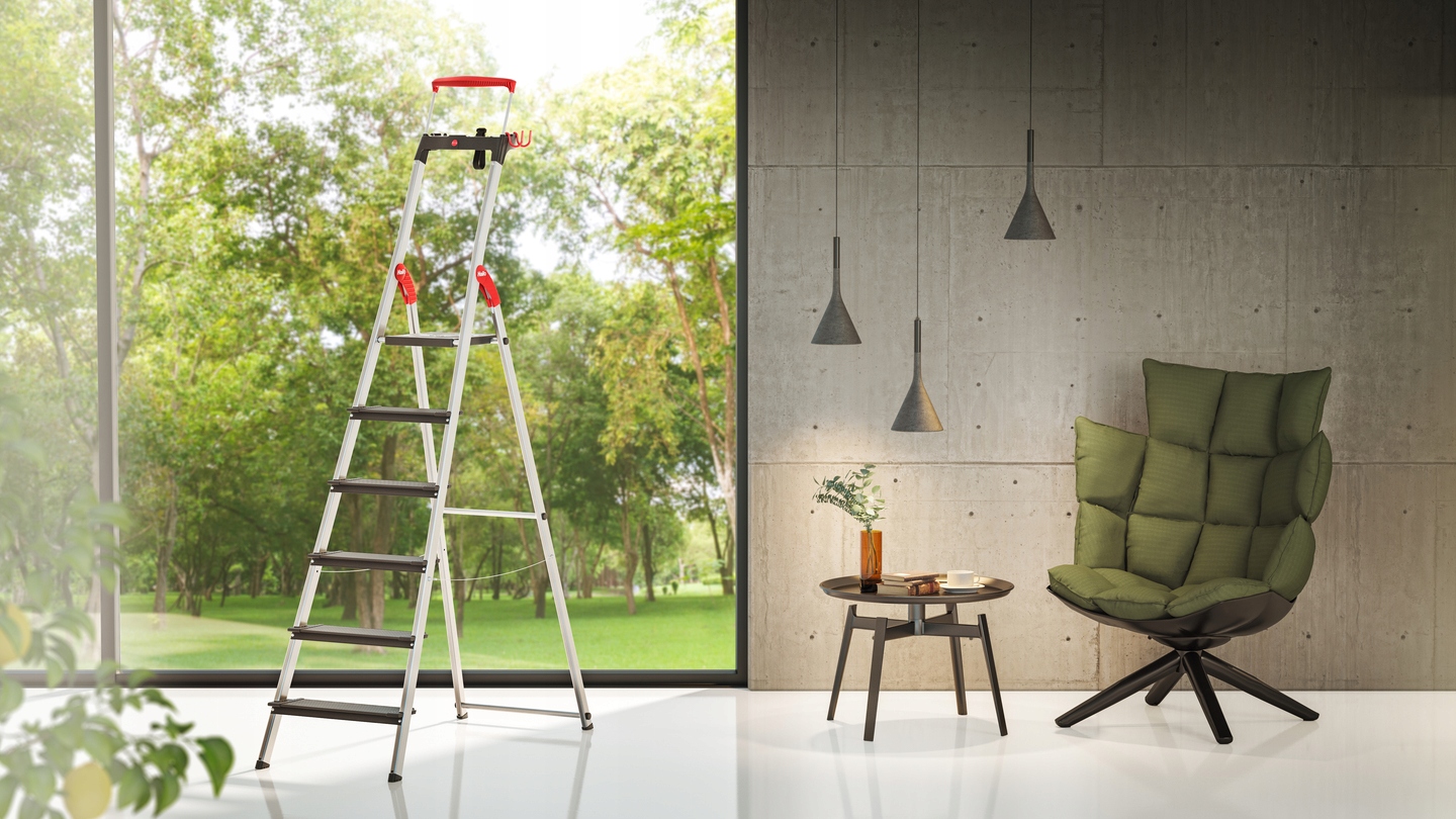 Алюминиевая безопасная лестница с многофункциональной полкой, защитной опорной планкой и замком платформы обеспечивает безопасность в формате XXL: очень широкие ступеньки - 130 мм