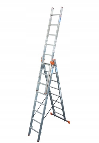 Трехэлементная многофункциональная лестница из алюминия, для использования в качестве приставной лестницы (рабочая высота ок. 6,05 м), выдвижная и отдельно стоящая с выдвижным элементом (рабочая высота ок. 4,40 м).