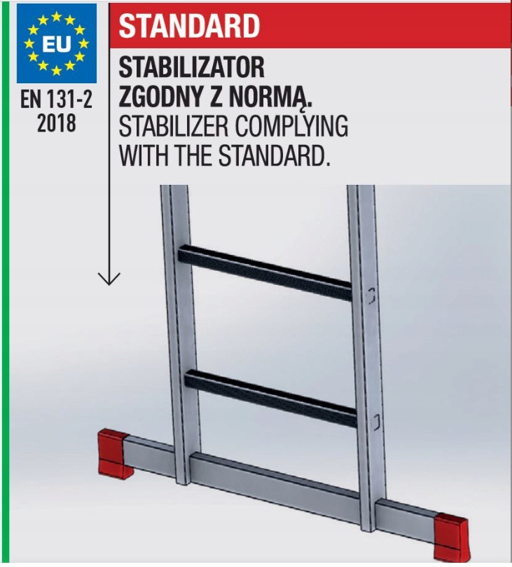 - Лестница имеет достаточно прочный стабилизатор с ножками из нескользящего материала, обеспечивающими стабильную поддержку лестницы во время работы.