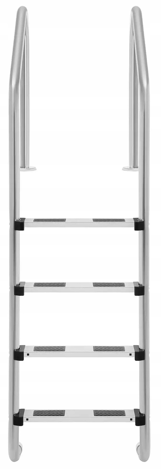 4 стальные ступени с нескользящей поверхностью прочно и надежно крепятся к трубам (также изготовленным из этого материала), что позволяет пользователям комфортно ими пользоваться. Максимальная нагрузка на лестницу бассейна — 180 кг.