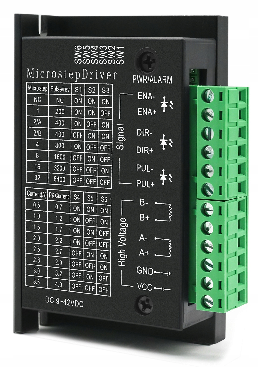 ⭐ Устройство может использоваться в двигателях разной мощности: от NEMA17 до NEMA24, это обеспечивает восемь настроек токаот 0,5 А (0,7 А в импульсе) до 3,5 А (4,0 А в импульсе) и семь настроек ступенчатого деления .