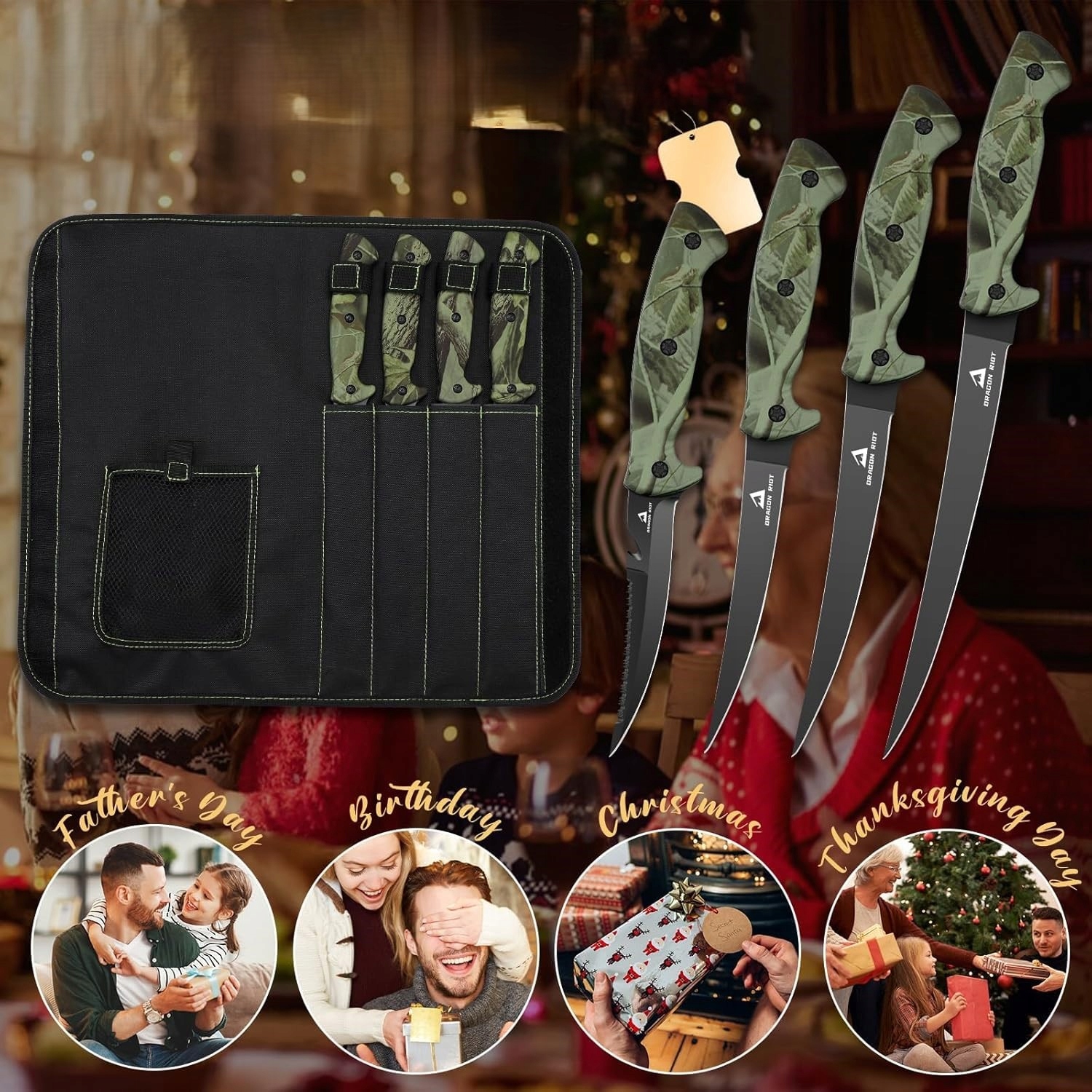 КОМПАСНЫ нуждается в рыбалке. Он содержит 5-дюймовый нож для приживки, 6-дюймовый филе нож, 7-дюймовый филе нож и 9-дюймовый нож для обрезки филе, благодаря которому у вас есть правильный инструмент для каждого вида рыбы. Ножи идеально подходят для таких задач, как вырезка приманки, филе рыба или отделение мяса от костей.