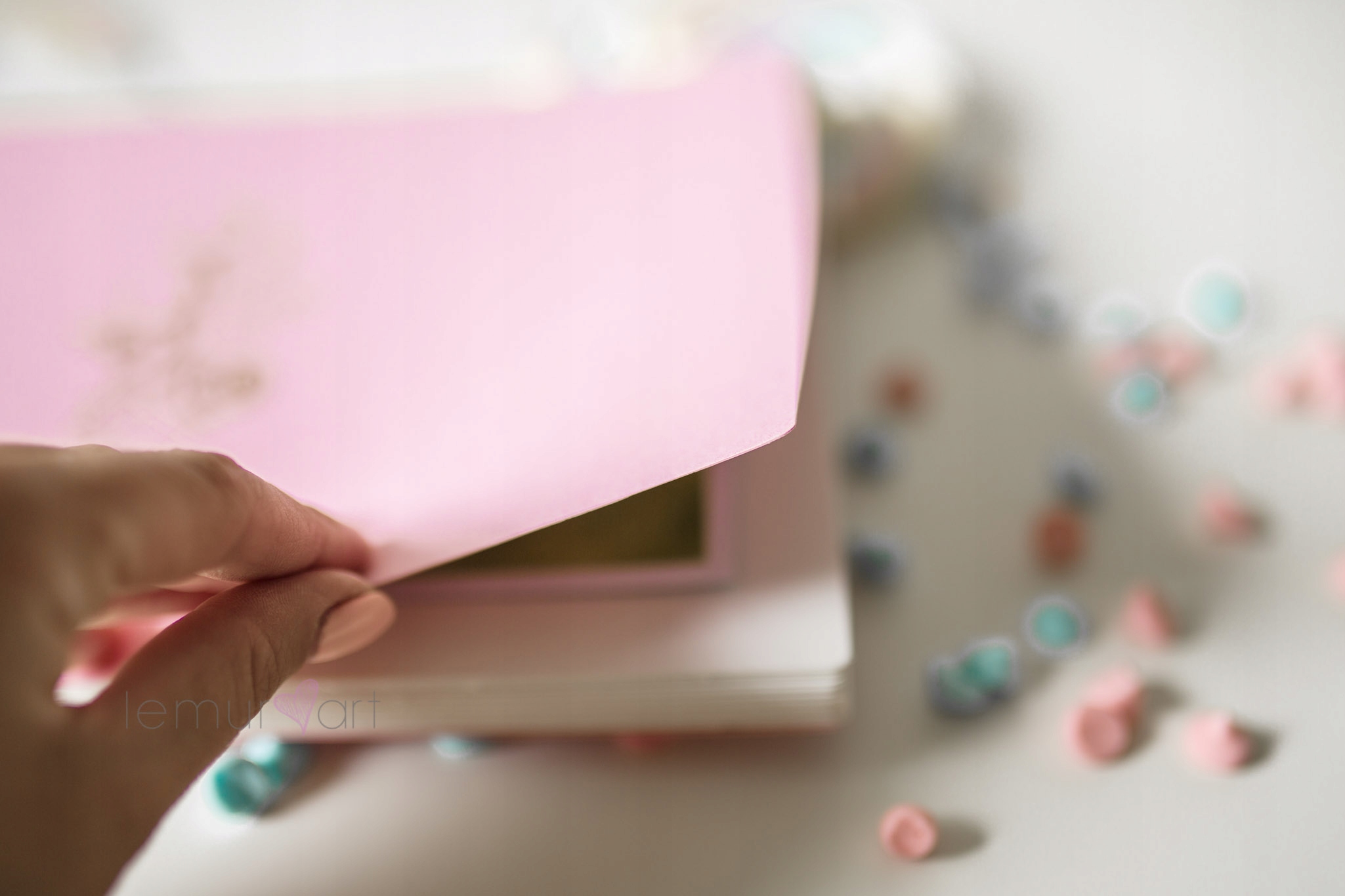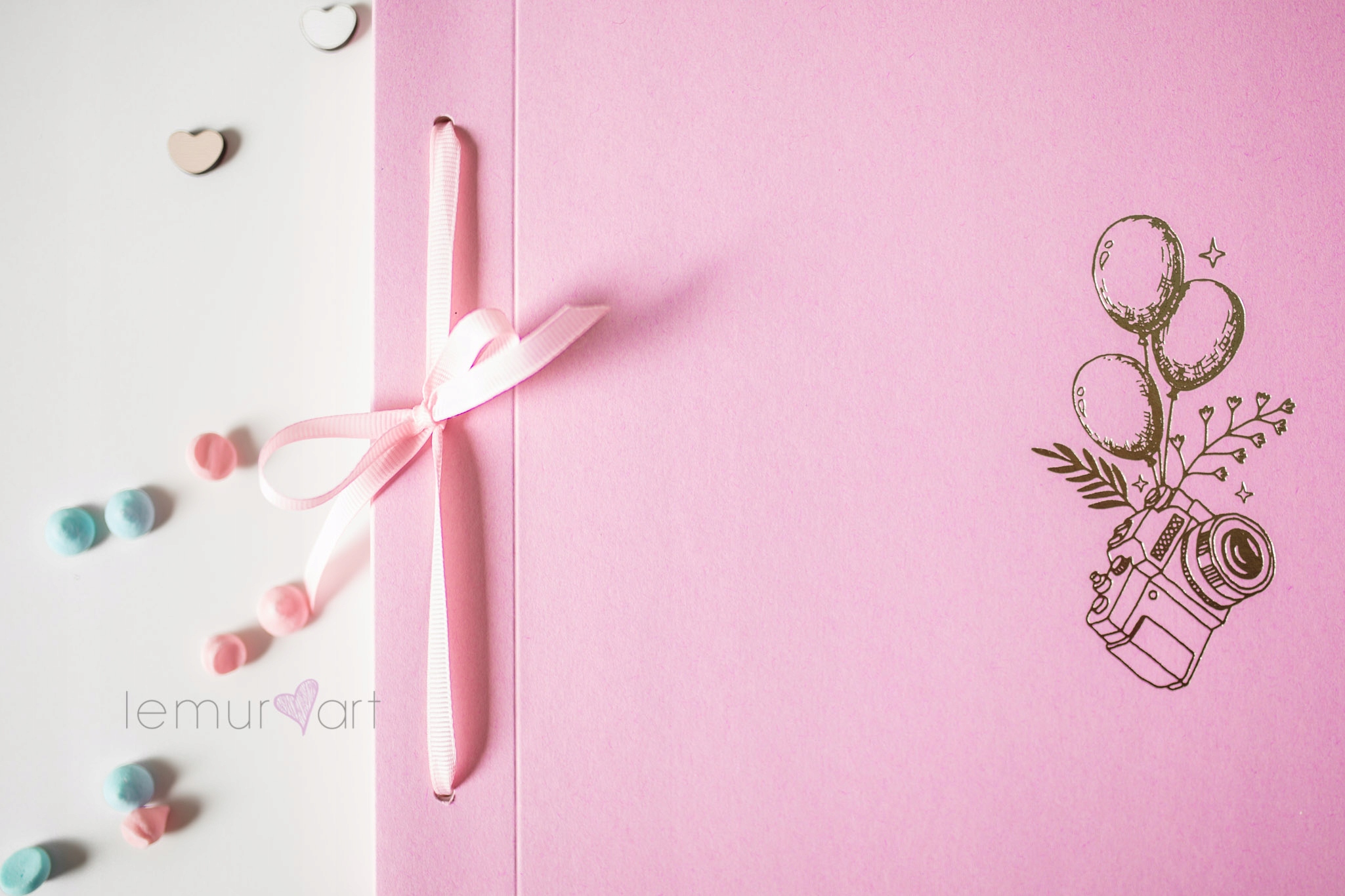 Альбом отличается розовой обложкой и толстыми белыми карточками весом 350 г, перевязанными элегантной лентой. .