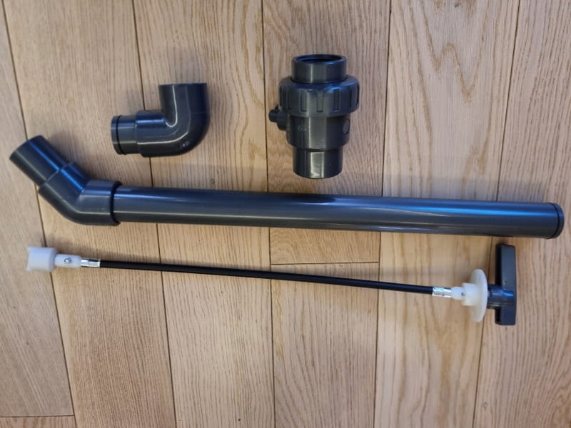 Система отвода бытовых сточных вод из бака с гибким трубопроводом для открытия шарового крана известной фирмы Reich. Шаровой кран имеет внутреннюю резьбу 1¼ для крепления на резервуаре. На валу рычага управления имеется монтажный диск диаметром 60 мм и 2 отверстия. Внешний диаметр выходной трубы 40 мм. Соединения труб могут вращаться и оснащены уплотнительными кольцами.