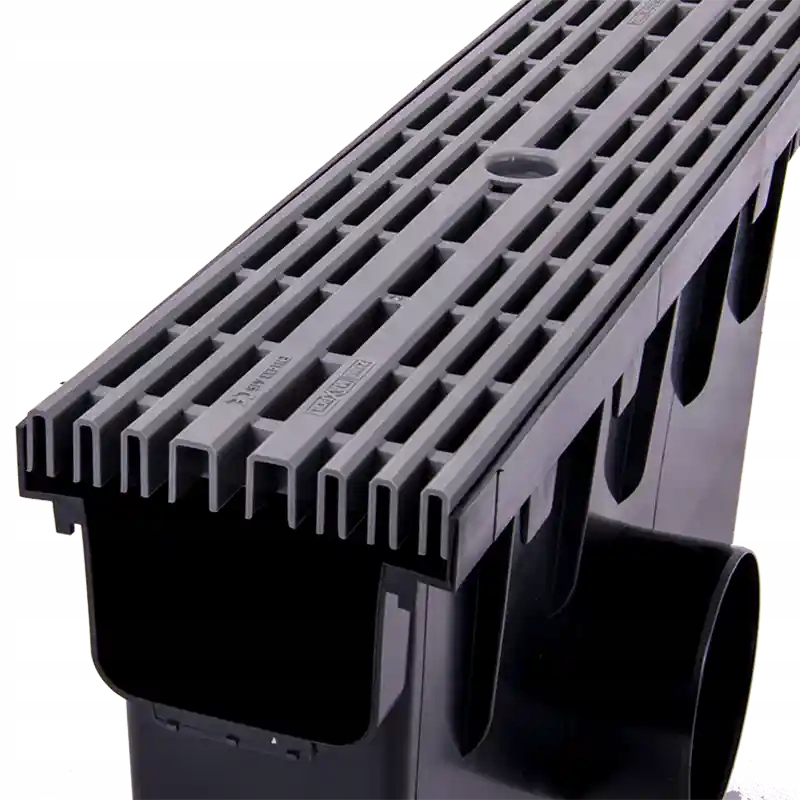 Комплект состоит из решетки, сборной корзины, шнека с крючком и приемного колодца, подходящего для линейного водостока высотой 98 мм.