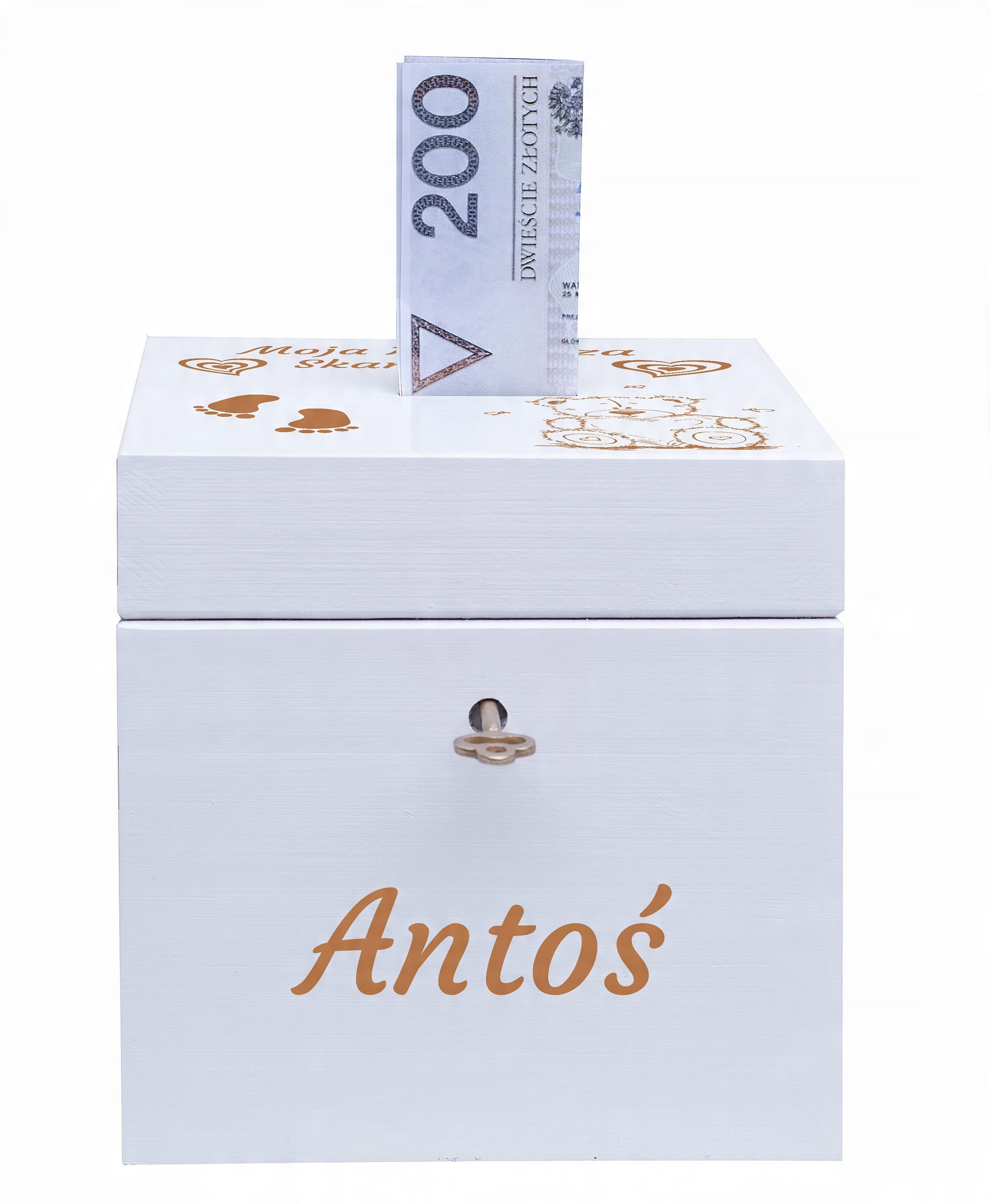 DREWNIANA BIAŁA skarbonka DZIECKO prezent z kluczykiem XXL