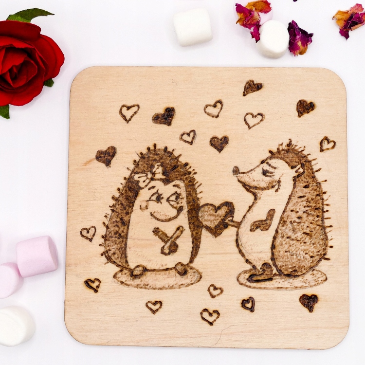 DREWNIANA RĘCZNIE WYPALANA PODKŁADKA POD KUBEK - Walentynki - Jeże