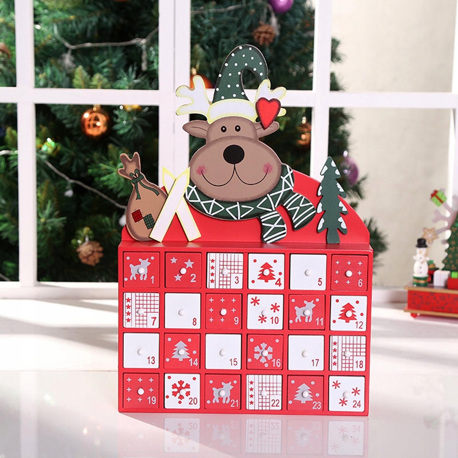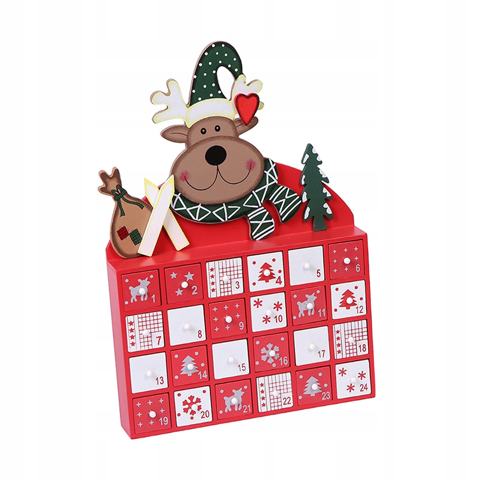 Drewniane pudełko na kalendarze z szufladami do przechowywania i wzorem renifera