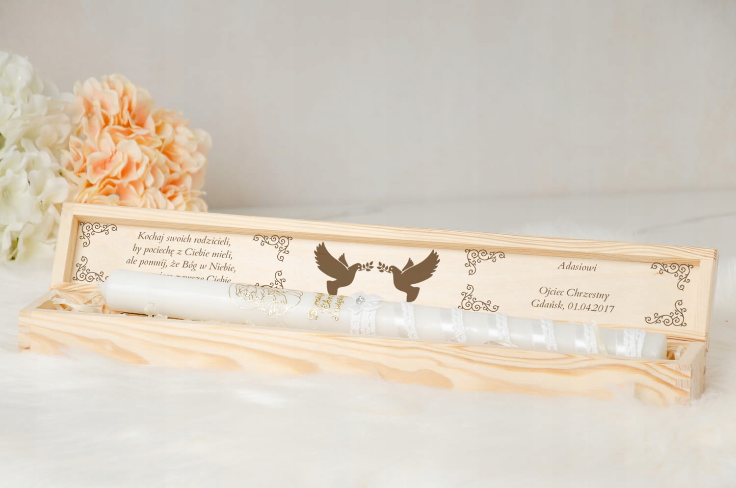 Красивый деревянный подсвечник с индивидуальной гравировкой. Шкатулка - уникальный сувенир Святого Крещения. Он также идеально подходит в качестве подарка. Он персонализирован снаружи и внутри коробки.