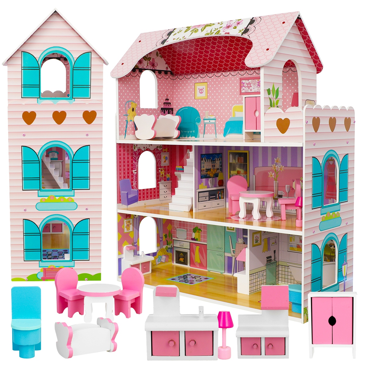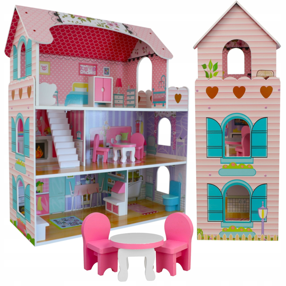 DREWNIANY DOMEK dla lalek duży RÓŻOWY + MEBLE mebelki 3 PIĘTRA TARAS dom