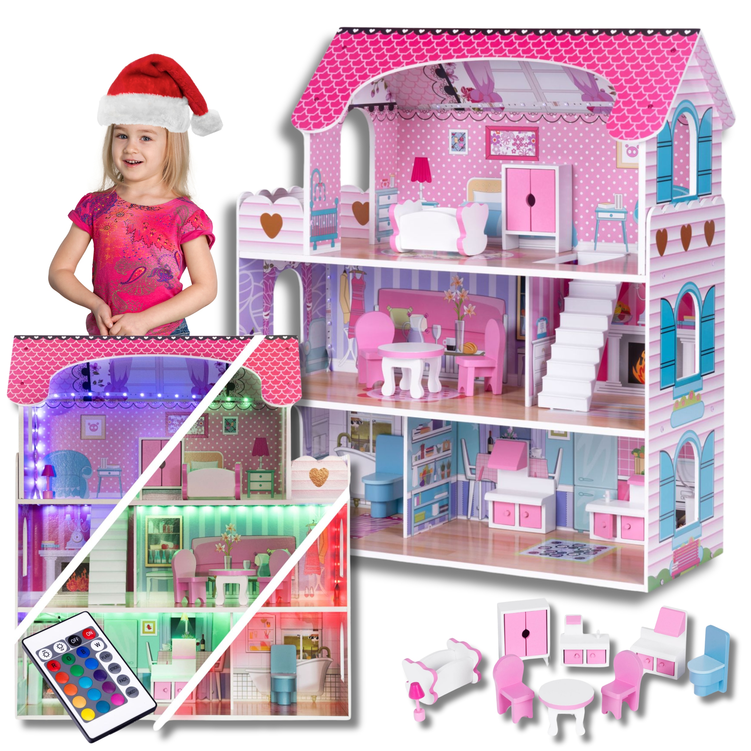 DREWNIANY DOMEK DLA LALEK Z LED ZESTAW 9 MEBELKÓW PREZENT DLA DZIEWCZYNKI