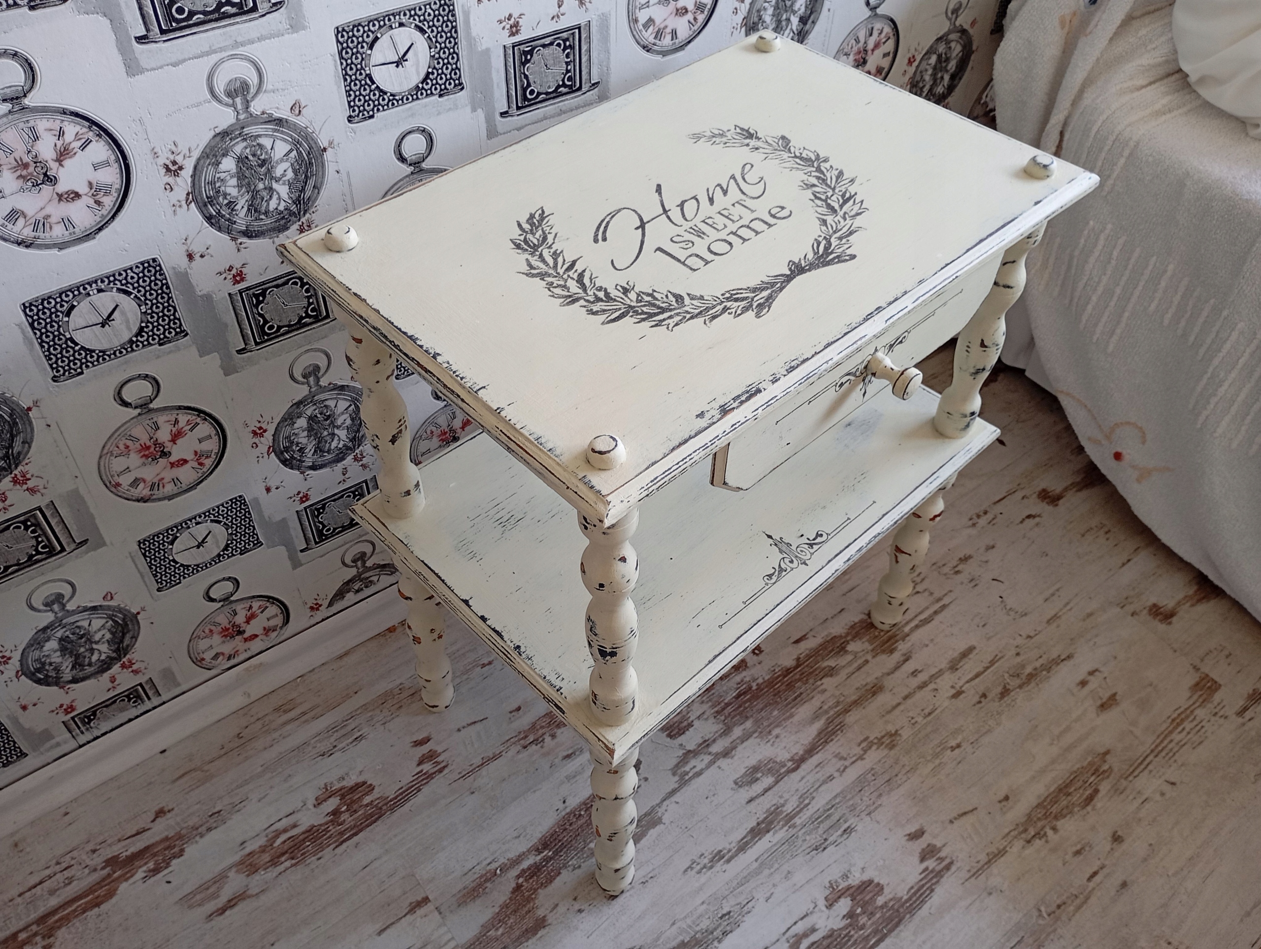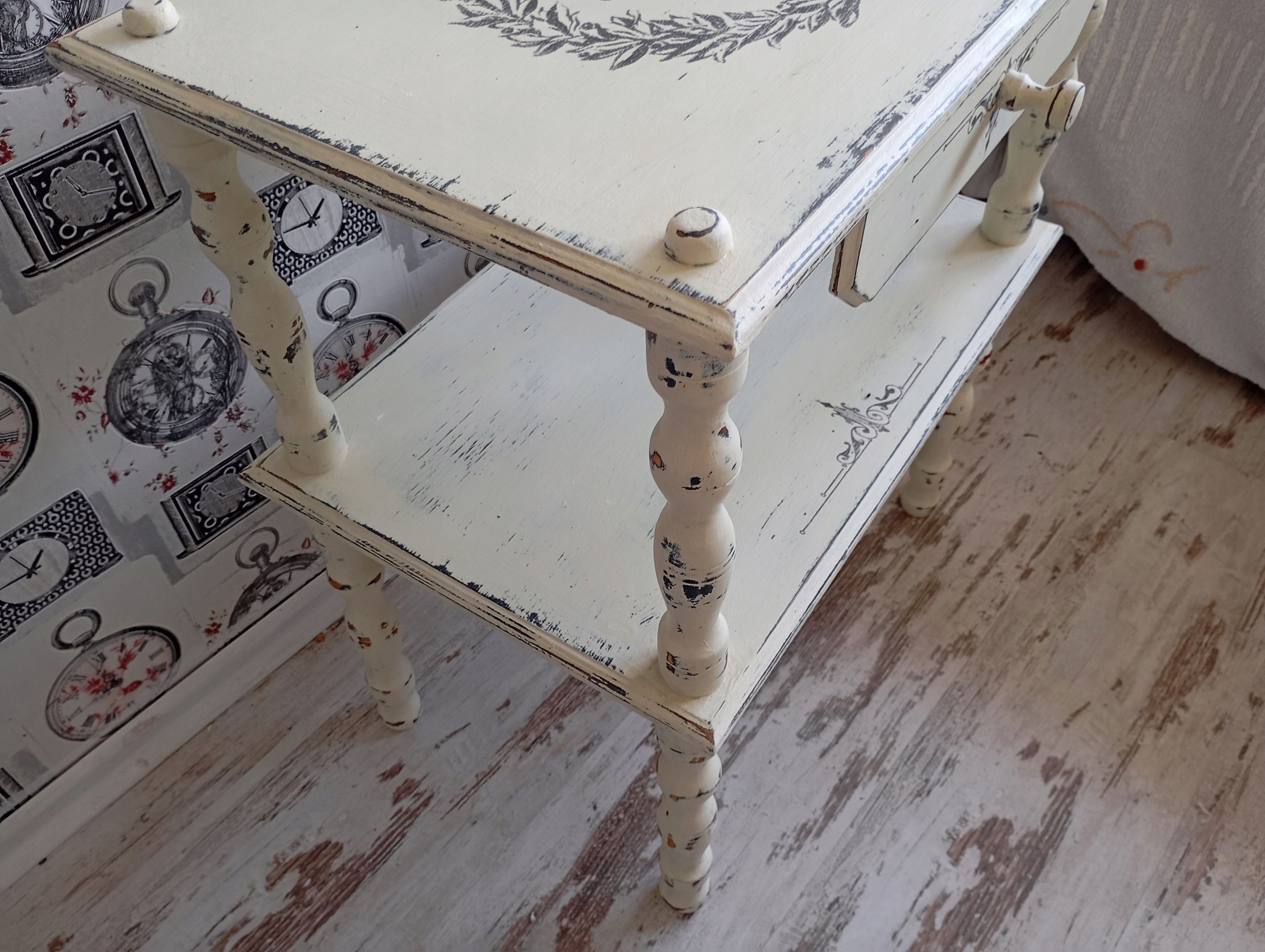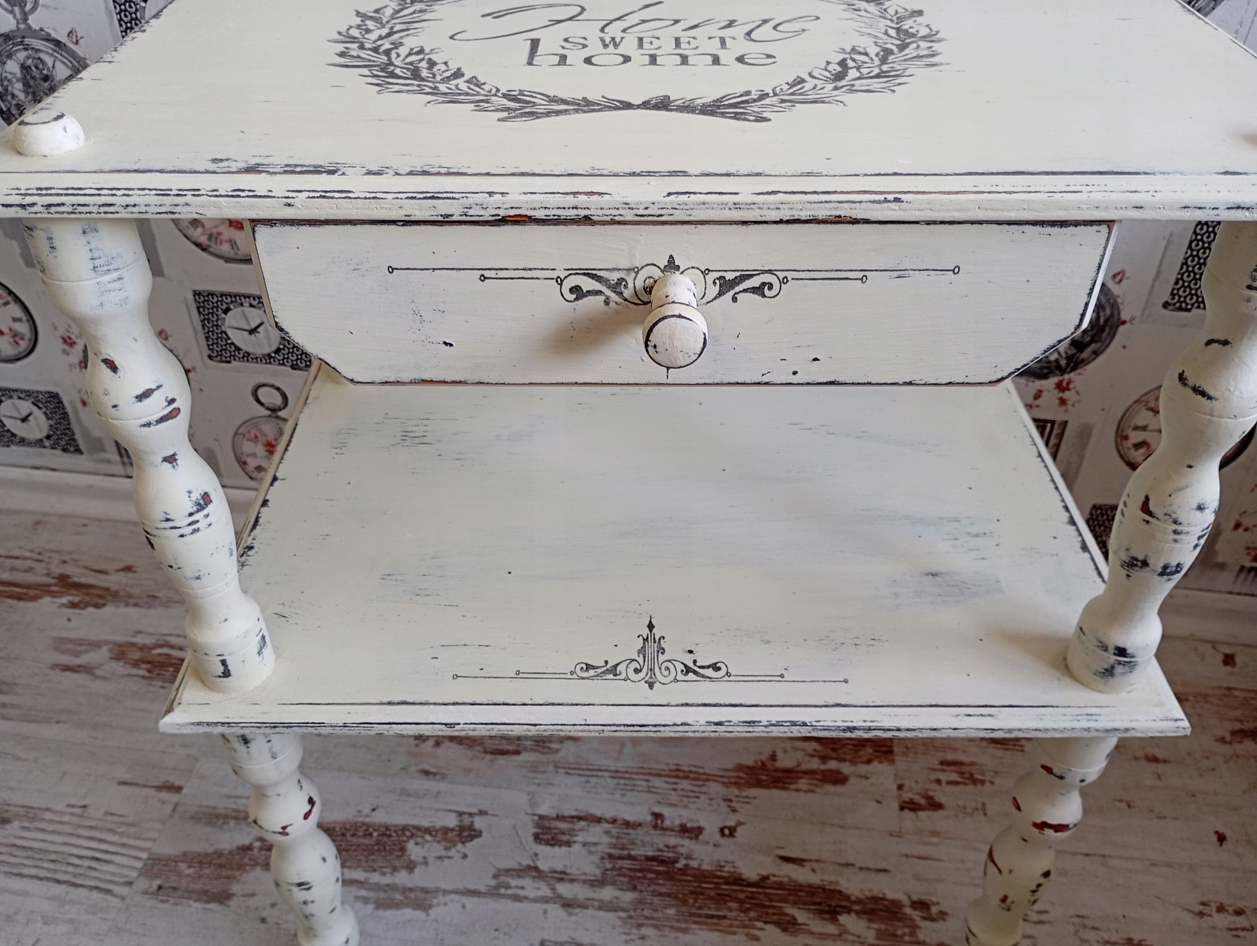 DREWNIANY MALOWANY STOLIK Z GRAFIKĄ SHABBY CHIC