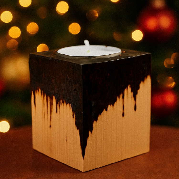 Уникальный деревянный подсвечник из натуральной древесины бука, украшенный абстрактным узором, вдохновленным тающим льдом. Морилки, нанесенные вручную, свободно струятся по поверхности, создавая органичный эффект. Каждый подсвечник создается индивидуально, что делает дизайн уникальным. Поверхность защищена матовым акриловым лаком, подчеркивающим структуру древесины и детали пирографии.