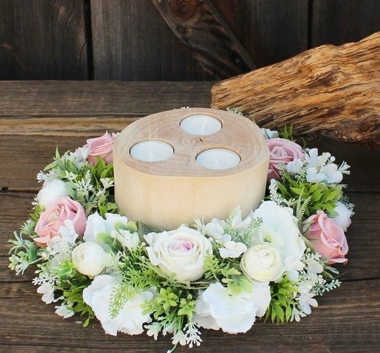 drewniany świecznik z kwiatami dekoracja stroik prezent