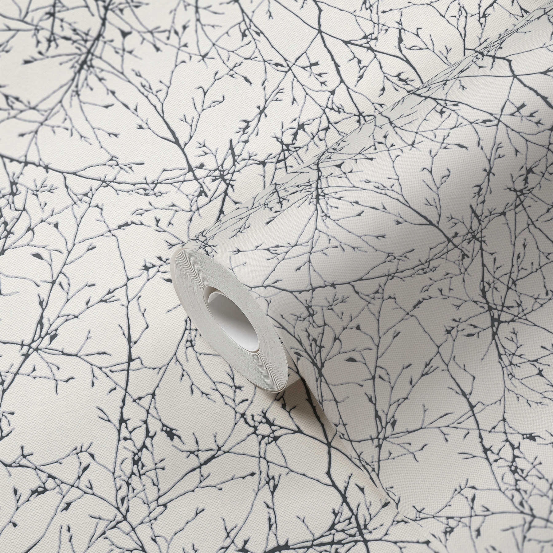Современные обои с изображением небольших веточек с черными лисичками на белом фоне.