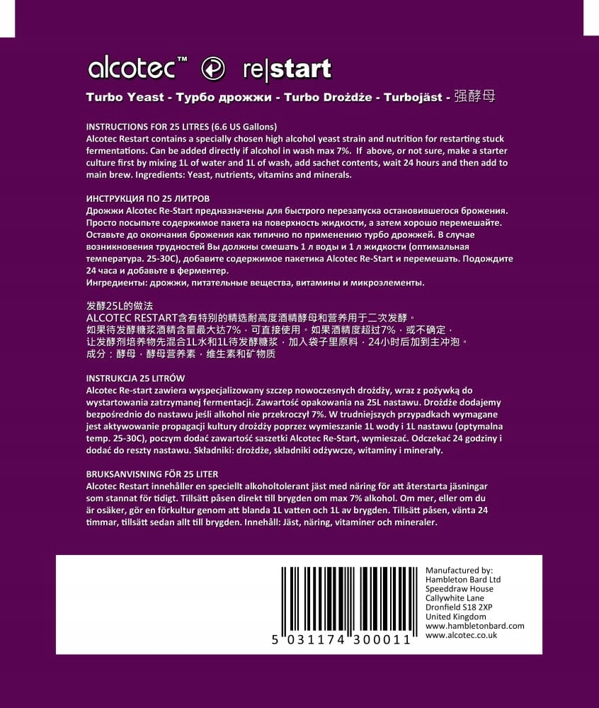 Дрожжи Alcotec Restart для дистилляции — очень эффективные и быстродействующие дрожжи для возобновления остановленного брожения. Alcotec Restart содержит специализированный штамм современных дрожжей, а также питательные вещества, запускающие остановленное брожение. Содержимое упаковки на 25 литров воды.