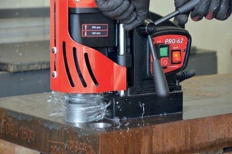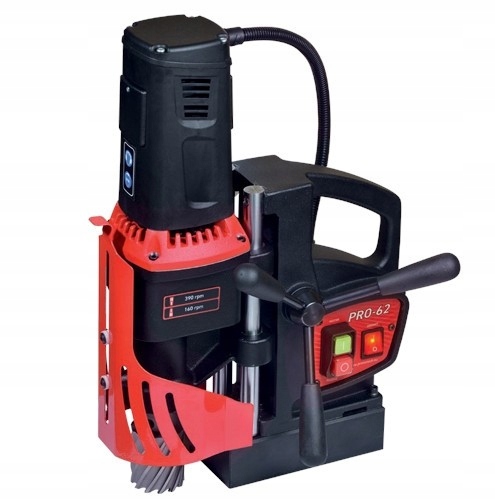 Электромагнитная дрель PRO 62 — небольшая универсальная машина, используемая как в сборочном, так и в производственном цехе. Дрель оснащена мощным двигателем мощностью 1600 Вт, позволяющим сверлить фрезой до 65 мм. Двухскоростной редуктор позволяет установить оптимальную скорость в зависимости от типа инструмента, типа его материала и диаметра. Машина имеет специальную систему направляющих колонн на самосмазывающихся втулках, не требующую каких-либо регулировок даже после длительного периода использования.