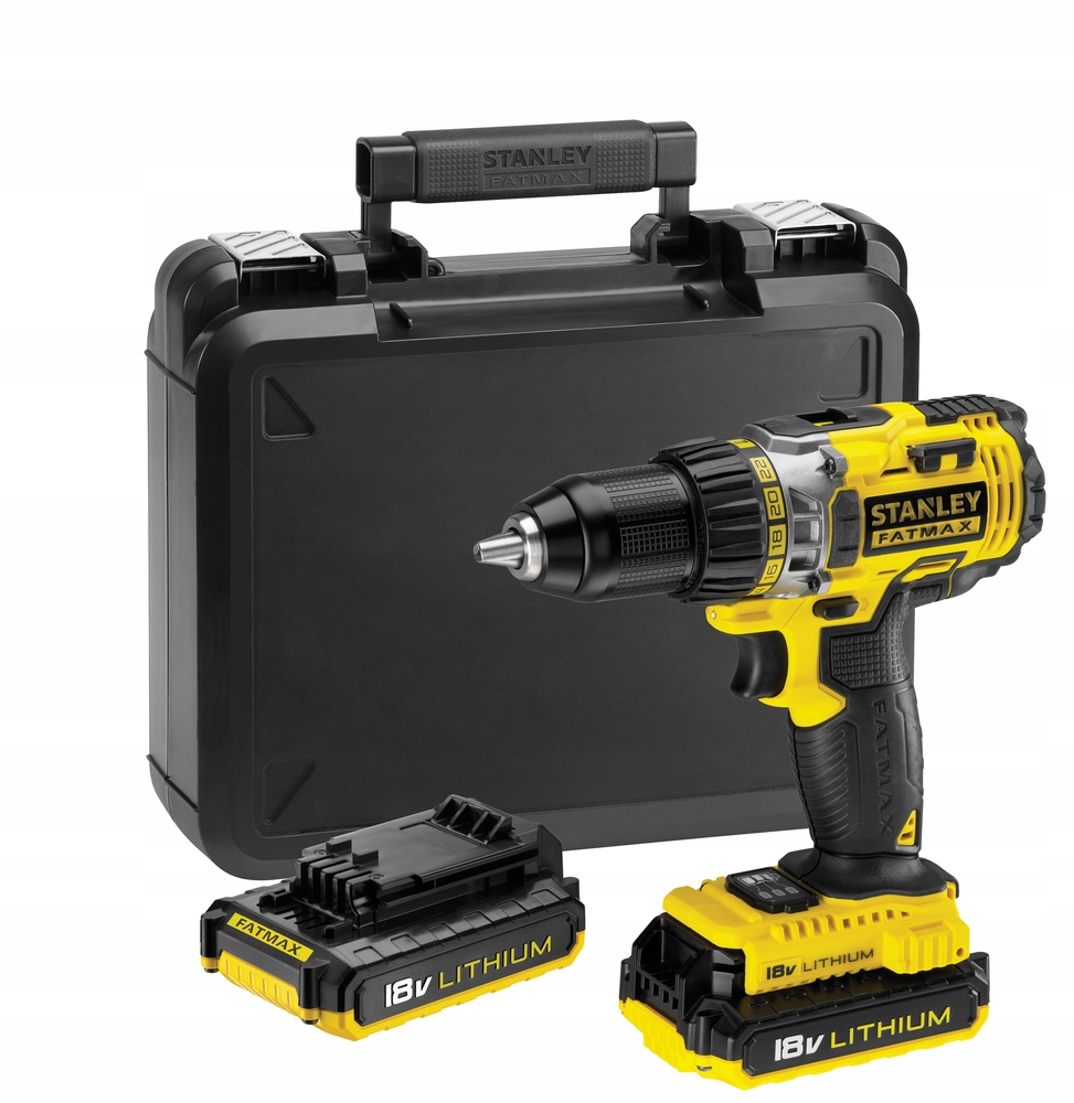Дрель-шуруповерт STANLEY FATMAX 18 В поставляется с двумя литий-ионными аккумуляторами емкостью 2,0 Ач.