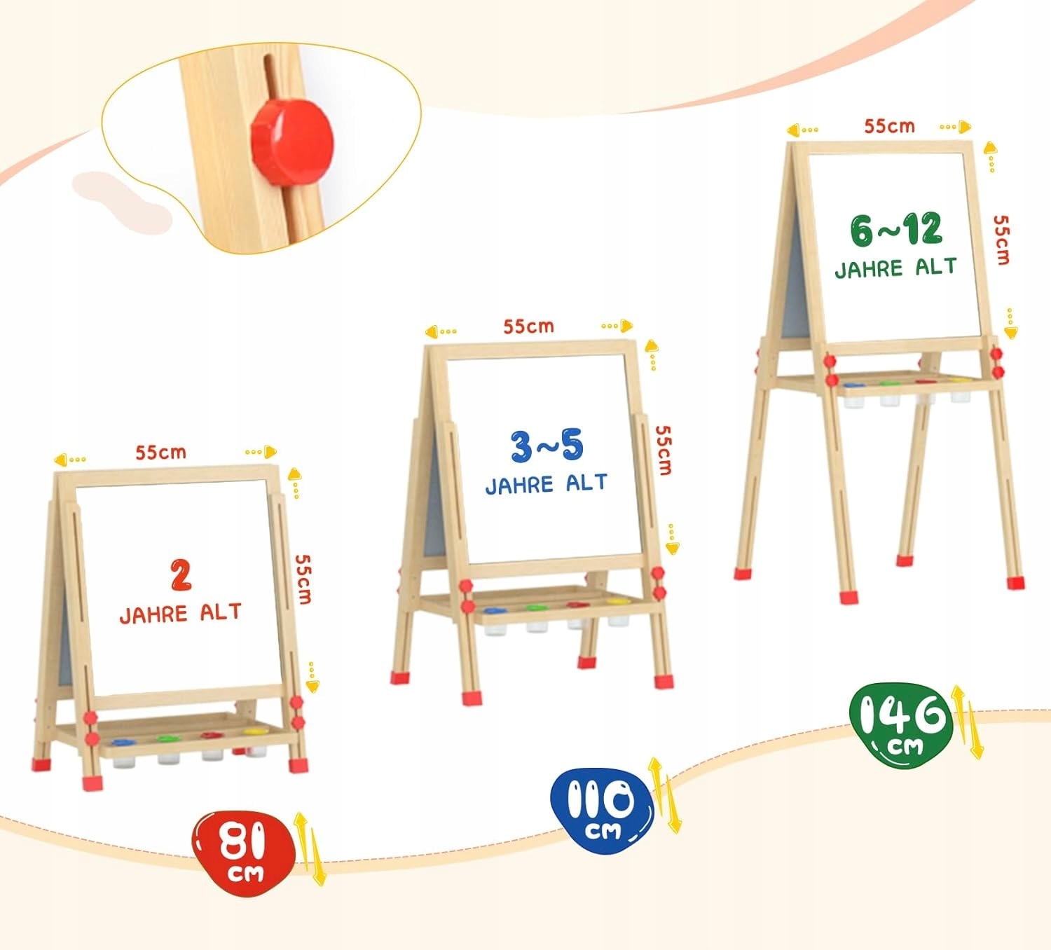 Размеры: размеры детской доски 53 х 53 см. Регулируется по высоте от 81 до 146 см. В комплект детской доски входят 24 аксессуара для рисования, которые помогут детям создавать произведения искусства и учиться.