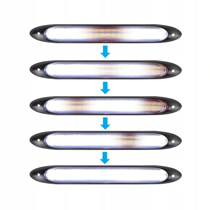 По умолчанию полоса светится белым цветом, а при включении поворотников белый свет гаснет и полоса мигает оранжевым цветом (поток поворотника). После выключения указателя поворота полоса примерно через 2 секунды загорится белым цветом как дневные ходовые огни. Кроме того, при включении мы имеем ВАУ-эффект, то есть свет появляется последовательно, пока не загорится полностью. Эффект последовательности: светло-синий — холодный белый. Затем фары переключаются на чисто-белый цвет — дневные ходовые огни.