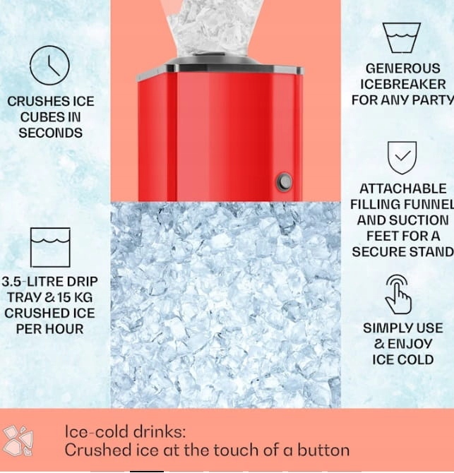 Ледоколка oneConcept с легкостью разобьет самый твердый лед. Прошли те времена, когда измельчение осуществлялось с помощью мышечной силы или ручной мясорубки, в результате чего льда получалось меньше, чем необходимо для приготовления напитков. В настоящее время этот процесс происходит автоматически с использованием мощного дробильного механизма. Просто поместите воронку, насыпьте в нее кубики льда и включите прибор. Через короткое время 3,5-литровый контейнер (приблизительно 1,75 кг) наполнится идеально измельченными кубиками льда. Ледоколка способна измельчить до 15 кг льда в час и обеспечить каждого участника вечеринки необходимым количеством льда для напитка, лимонада или кайпириньи.