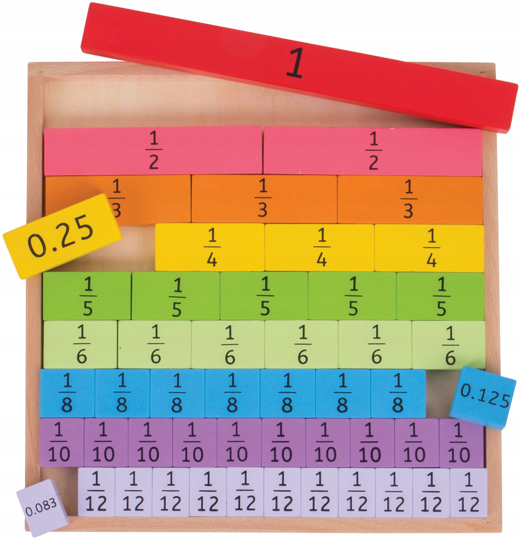 Эта замечательная головоломка знакомит детей с миром дробей и помогает им понять, что такое дроби. На примере блоков разной длины 9 цветов ребенок учится распознавать, из скольких частей состоит вся полоса блоков и как их считать.