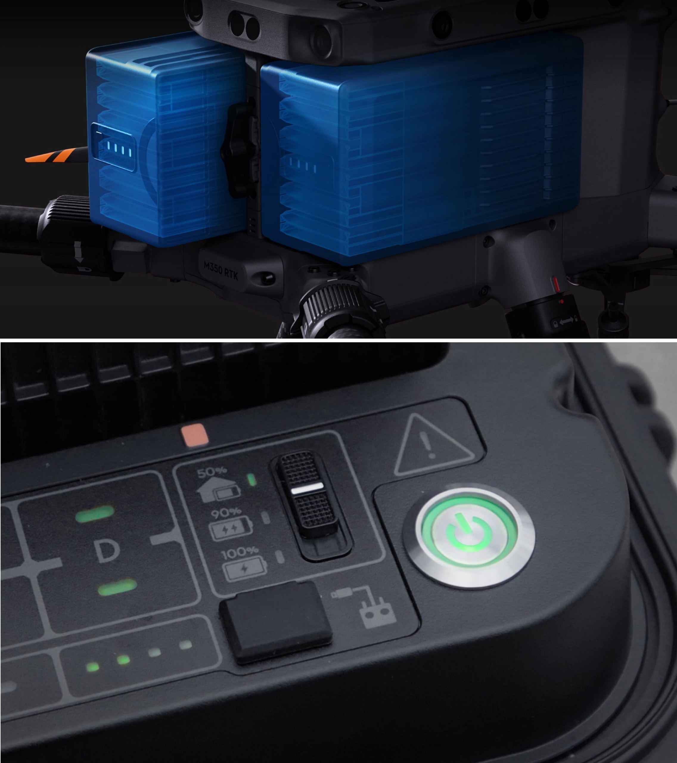 Matrice 350 RTK поддерживает новый тип аккумуляторов TB65, что позволяет заменять их, не отключая питание. Аккумулятор обеспечивает до 400 циклов зарядки и разрядки [3], что снижает стоимость одного полета.