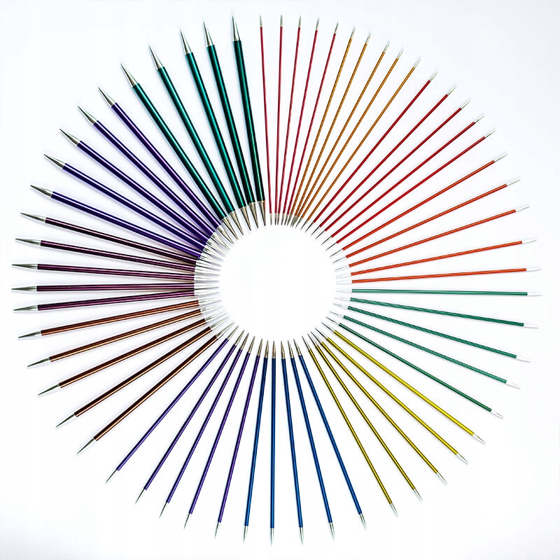 ряд металлических проводов zing в металлическом, блестящем покрытии, в цветах, соответствующих конкретным размерам и блестящим серебряным наконечникам со средним фокусом - подходит для всех типов пряжи и иглы