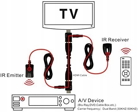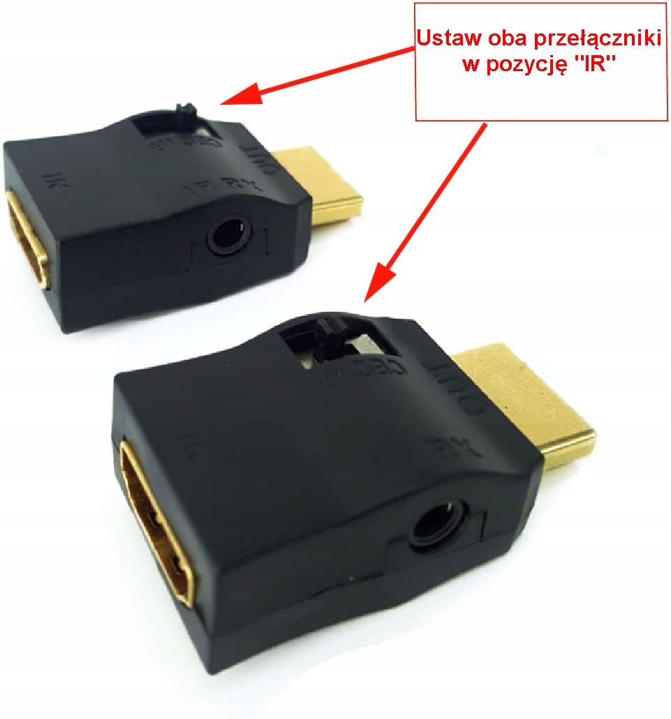 - передатчик и приемник подключить (через прикрепленные преобразователи) через кабель HDMI , которые подключены к устройствам ( Необходимо провести дополнительный кабель между транститорным и IR-приемником ). Эта функциональность полезна, когда мы не можем вести или скрыть дополнительный кабель между, например, Телевизор и декодер или другое устройство, или запуск такого кабеля - это хлопотно, например, На большем расстоянии.