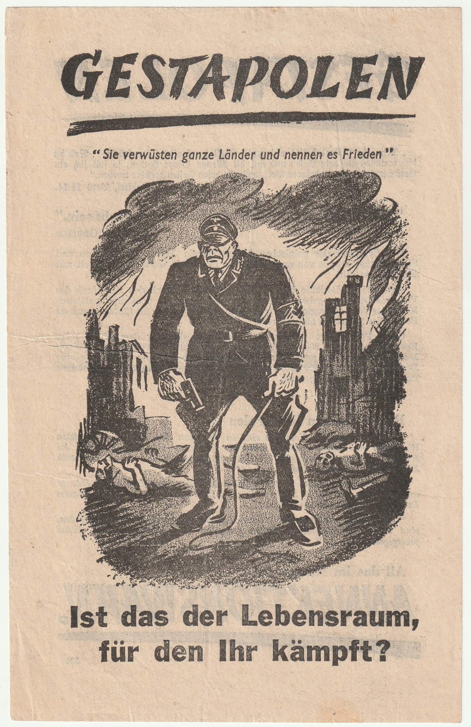 Вторая мировая война. Пропаганда. Гестаполен Британская листовка на немецком языке с 1940 года, с названием в сочетании со словами гестапо и Полена, двойной; Размеры 133x210 мм: карикатура примитивного нациста на фоне опустошенной Польши, в нижнем вопросе. (Это жизненное пространство, за которое вы боретесь?), На обороте цитаты Гаулитера Артура Грейзера, объявляющего «жесткую, но справедливую судьбу поляков», в сочетании с отношениями между Ватиканским радио об терроре в оккупированной стране.